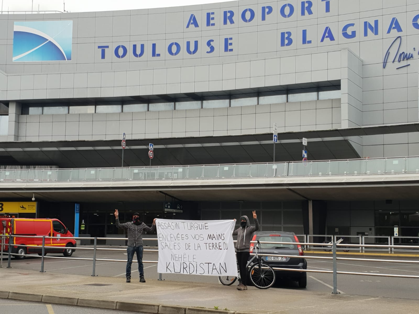 İlk olarak Toulouse Üniversitesi’nde gençler üzerinde Fransızca, “Kirli ellerini Kürdistan’dan çek katil Türkiye” yazan pankartı açtı. Üniversite girişinde yaklaşık yarım saat burada eylemlerini sürdüren gençler, daha sonra Toulouse Havaalanı’na geçti. Gençler burada da havaalanı girişinde açtıkları pankart ile faşist Türk devletinin Kürdistan’a saldırı ve işgal politikasını teşhir etti.