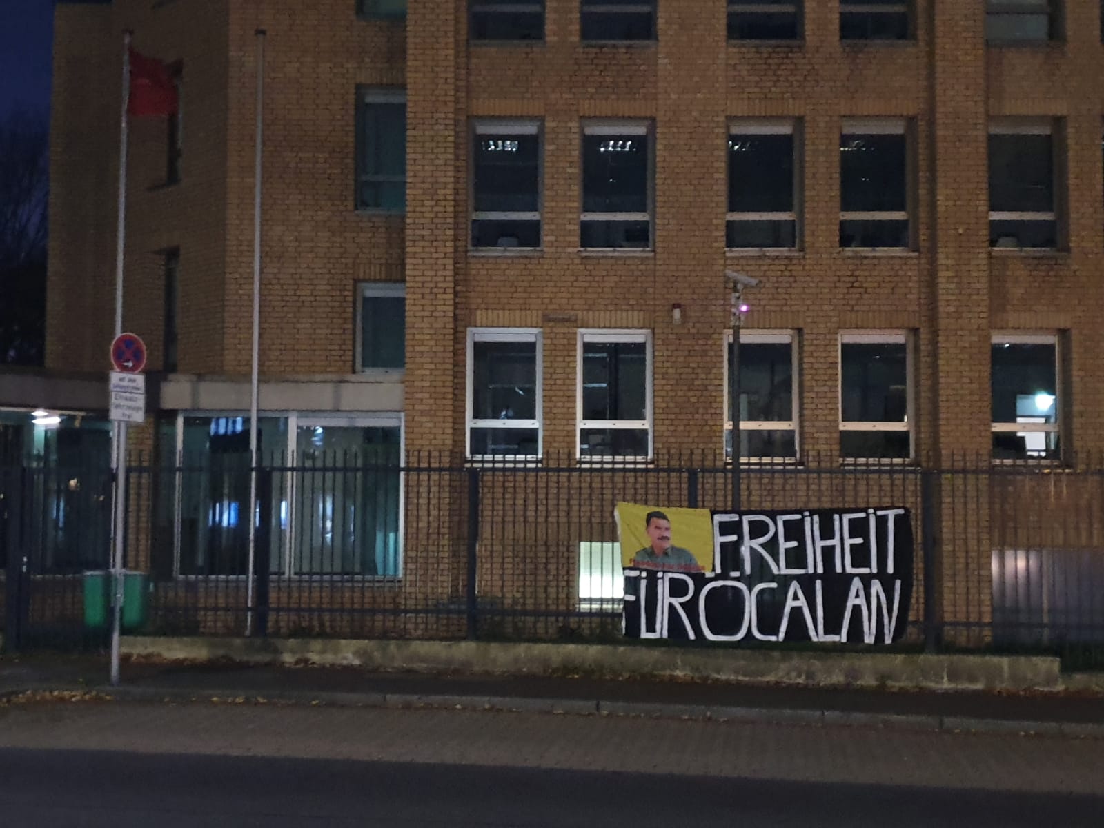 Üzerinde Almanca, “Öcalan’a Özgürlük” yazan pankart ve Önder Öcalan’ın posterini Başkonsolosluk binasına asan gençler, Halklar Önderi Abdullah Öcalan’ın fiziki özgürlüğü sağlanana kadar her an her yerde eylem halinde olacaklarını belirterek, tüm Kürt gençlerini de eylemlere katılmaya çağırdılar.