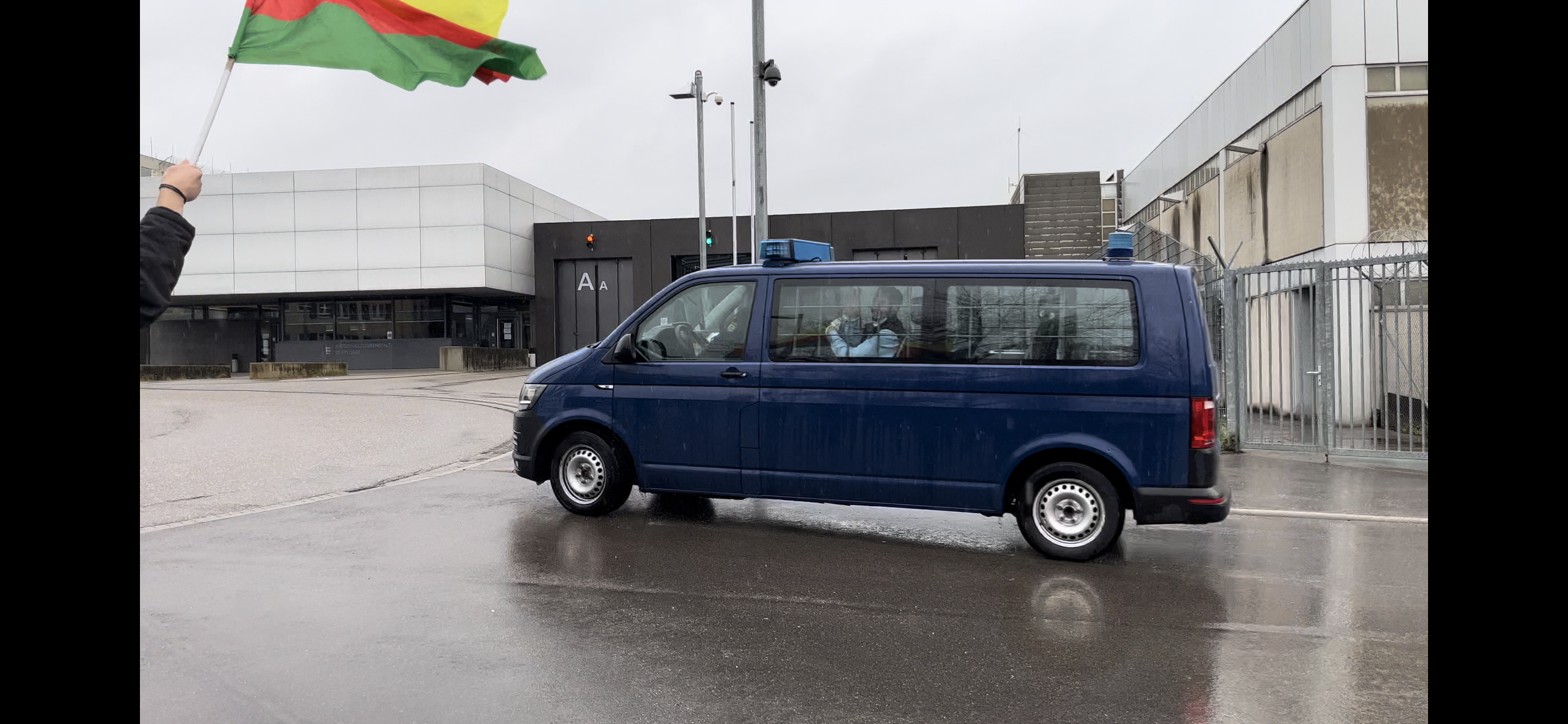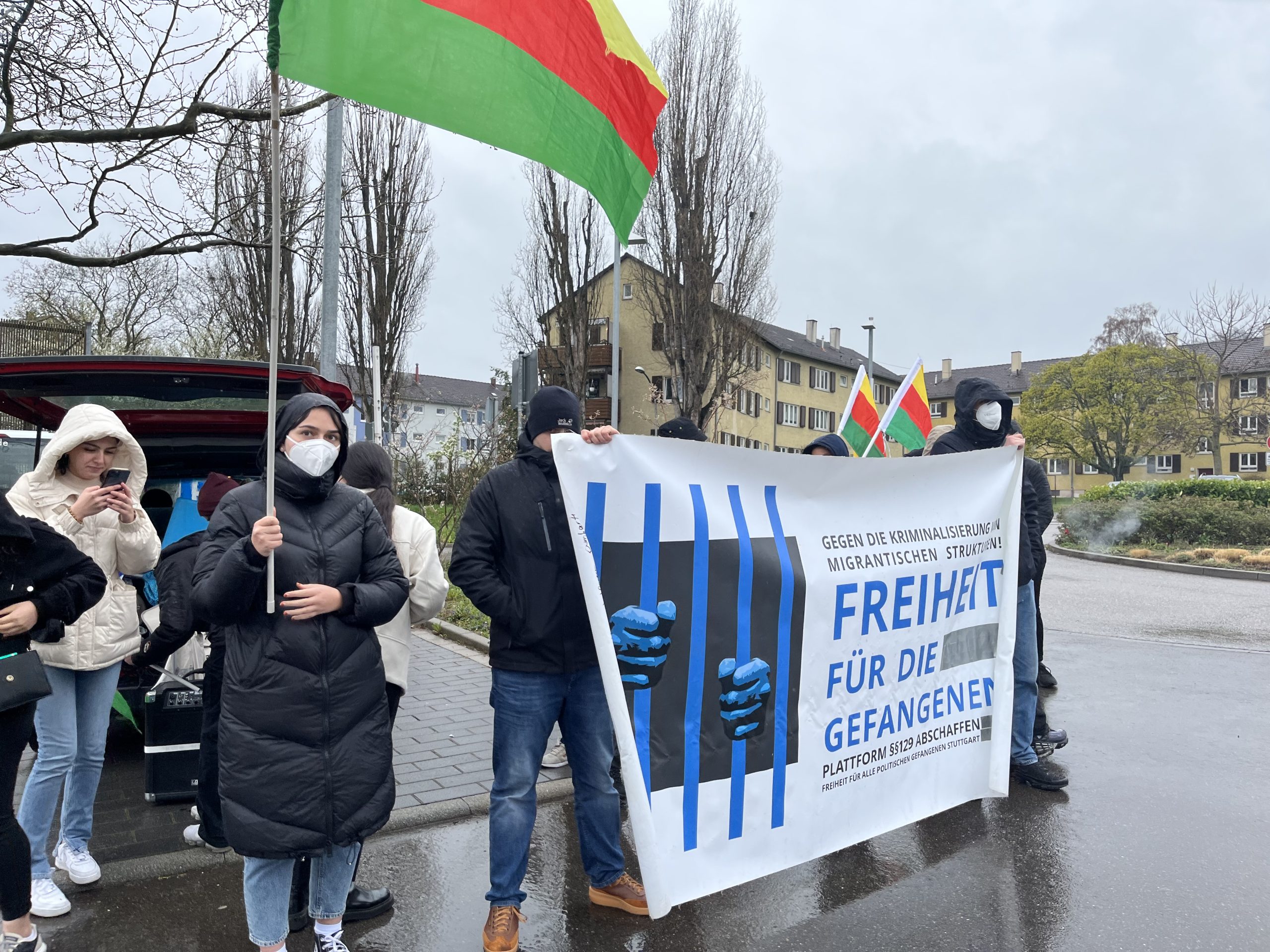 Stammheim bölge mahkemesi önünde bir araya gelen gençler “Siyasi tutsaklara özgürlük” yazılı pankart açtılar. Duruşmaya katılan gençler Alman devletinin tüm yoğun baskı ve tecrit politikasına karşı güçlü bir katılımla destek verdiler. Mahkemenin gerçekleşeceği alana araba içerisinde gelen Merdan K’yı gören gençler “Bijî Serok APO” sloganları ile destek verdiler.