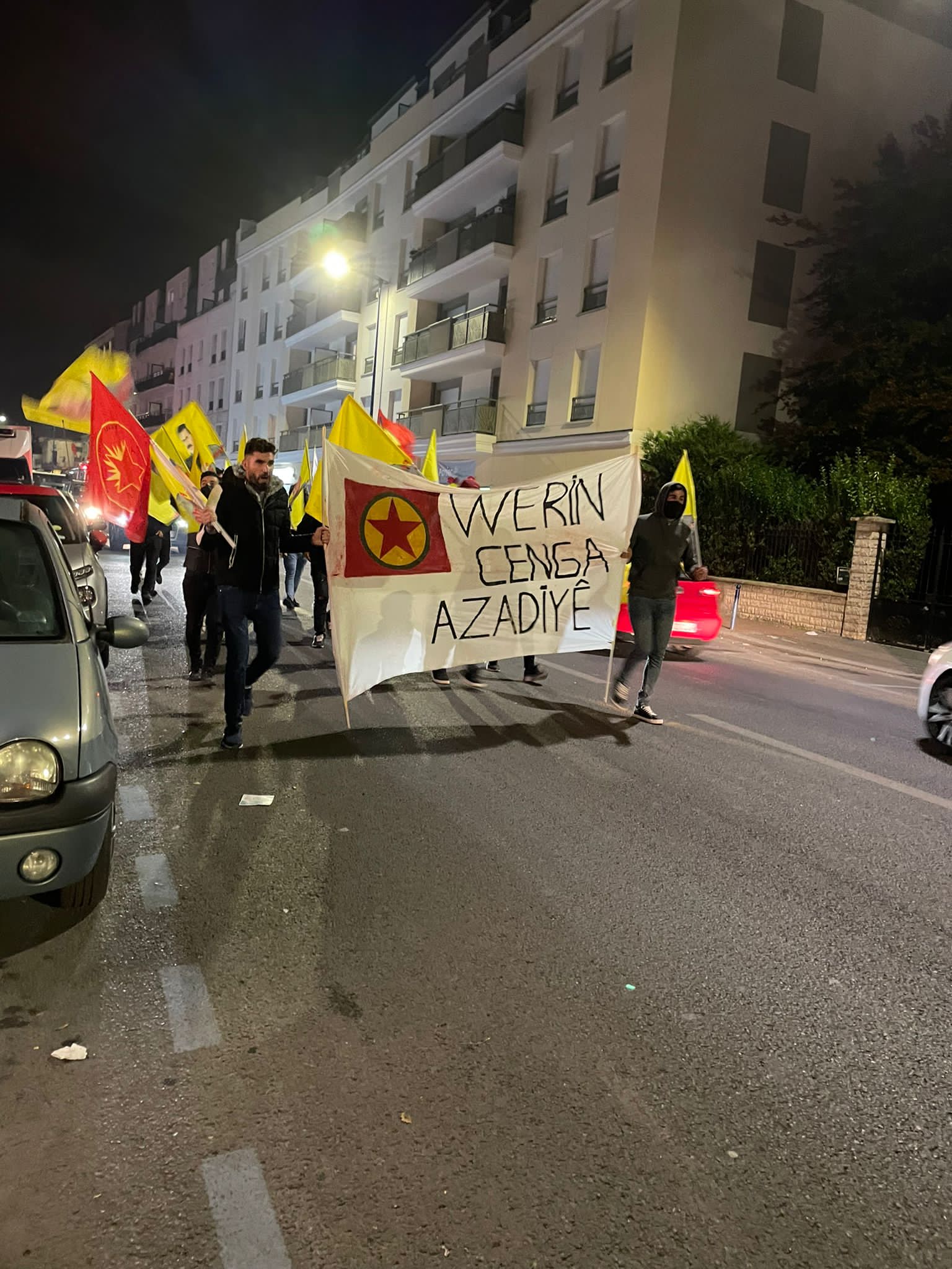 Gençler sık sık“Assassin Erdogan (Katil Erdoğan)”, “A Bas Le Régime Fasciste En Turquie (Kahrolsun Faşist Türk Rejimi)”, “Bijî Serok APO” ve “Bijî Berxwedana Gerîla” sloganları attılar.