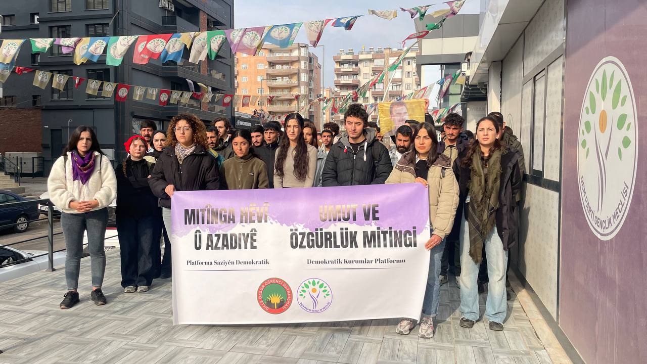 Halkların Eşitlik ve Demokrasi Partisi (DEM Parti), Demokratik Bölgeler Partisi (DBP) gençlik meclisleri ve Dicle Özgür Öğrenci Dayanışması, 4 Ocak’ta Amed İstasyon Meydanı’nda gerçekleştirilecek “Umut ve Özgürlük” mitingine dair açıklama yaptı. DEM Parti Amed İl Örgütü’nde yapılan açıklamanın Türkçesini Dicle Özgür Öğrenci Dayanışması üyelerinden Diyar Soyal, Kürtçesini ise DEM Parti Gençlik Meclisi üyesi Berivan Kocaoğlu yaptı.