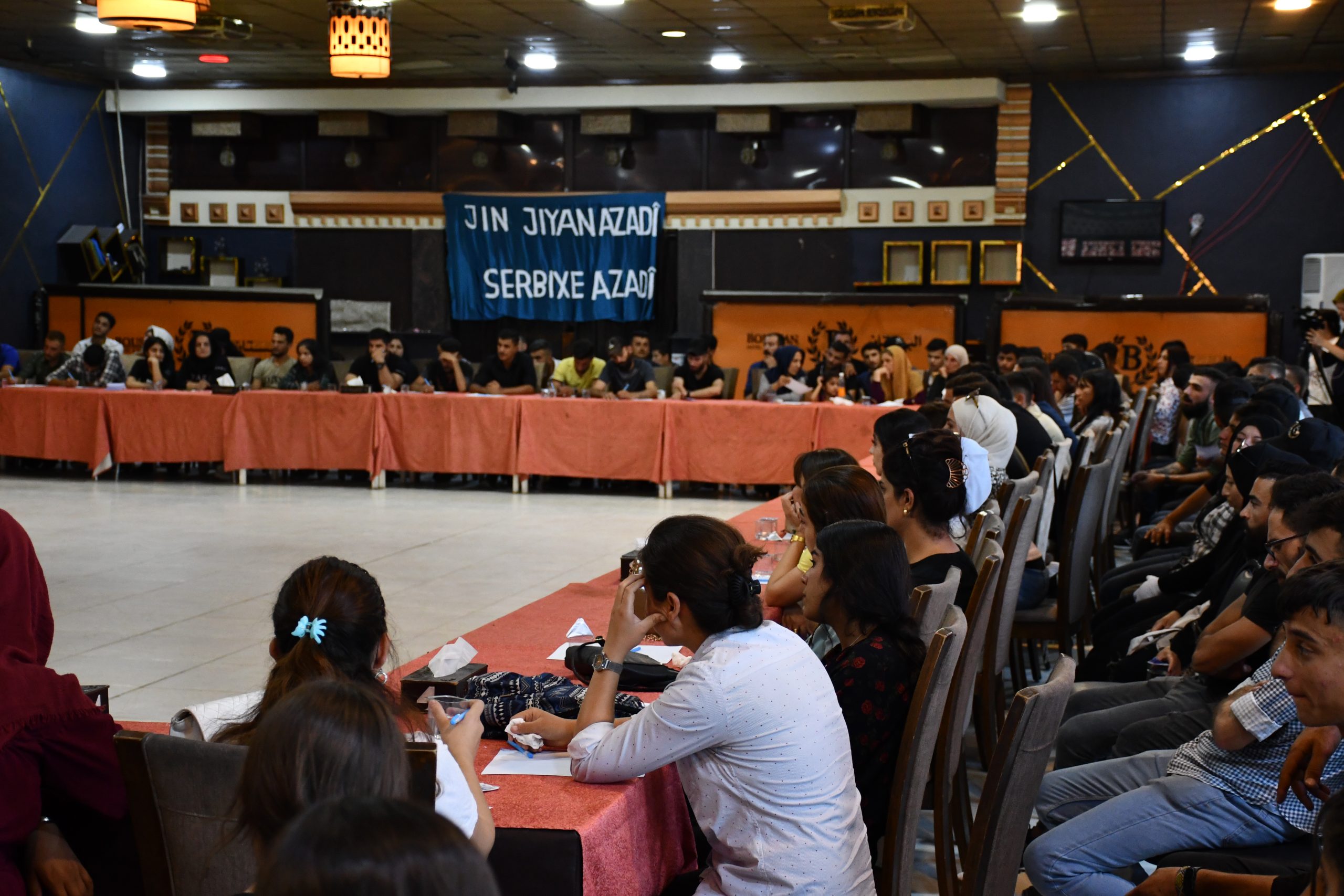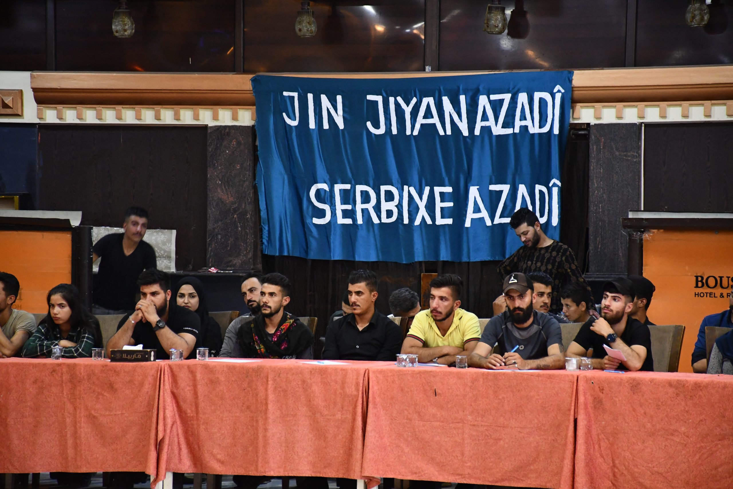 HESEKÊ – Bugün Devrimci Gençlik Hareketi (TCŞ) ve Genç Kadınlar Birliği (YJC) öncülüğündeHeseké kentinde bir araya gelen gençler ve genç kadınlardan oluşan 120 delege, “Toplumsal Cinsiyeti Aşma” konulu çalıştaya katıldı. Çalıştaya MSD Gençliği, PYD Gençliği, Pêşaroj Gençliği, TEV-DEM Gençliği üyeleri katıldı. Kongra-Star ve TEV-DEM konukları da katıldı.