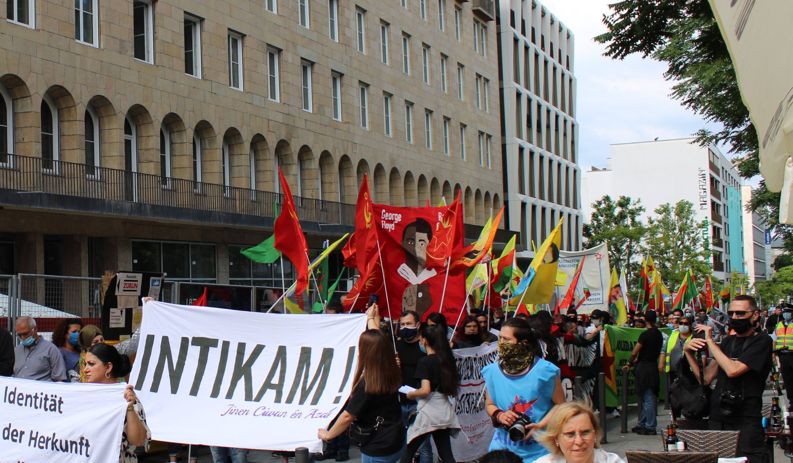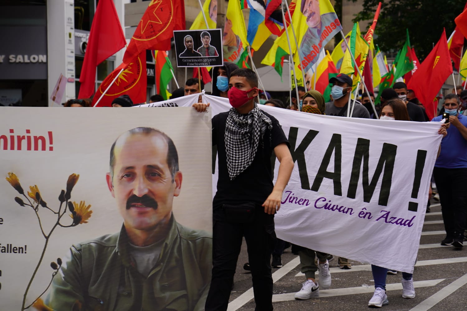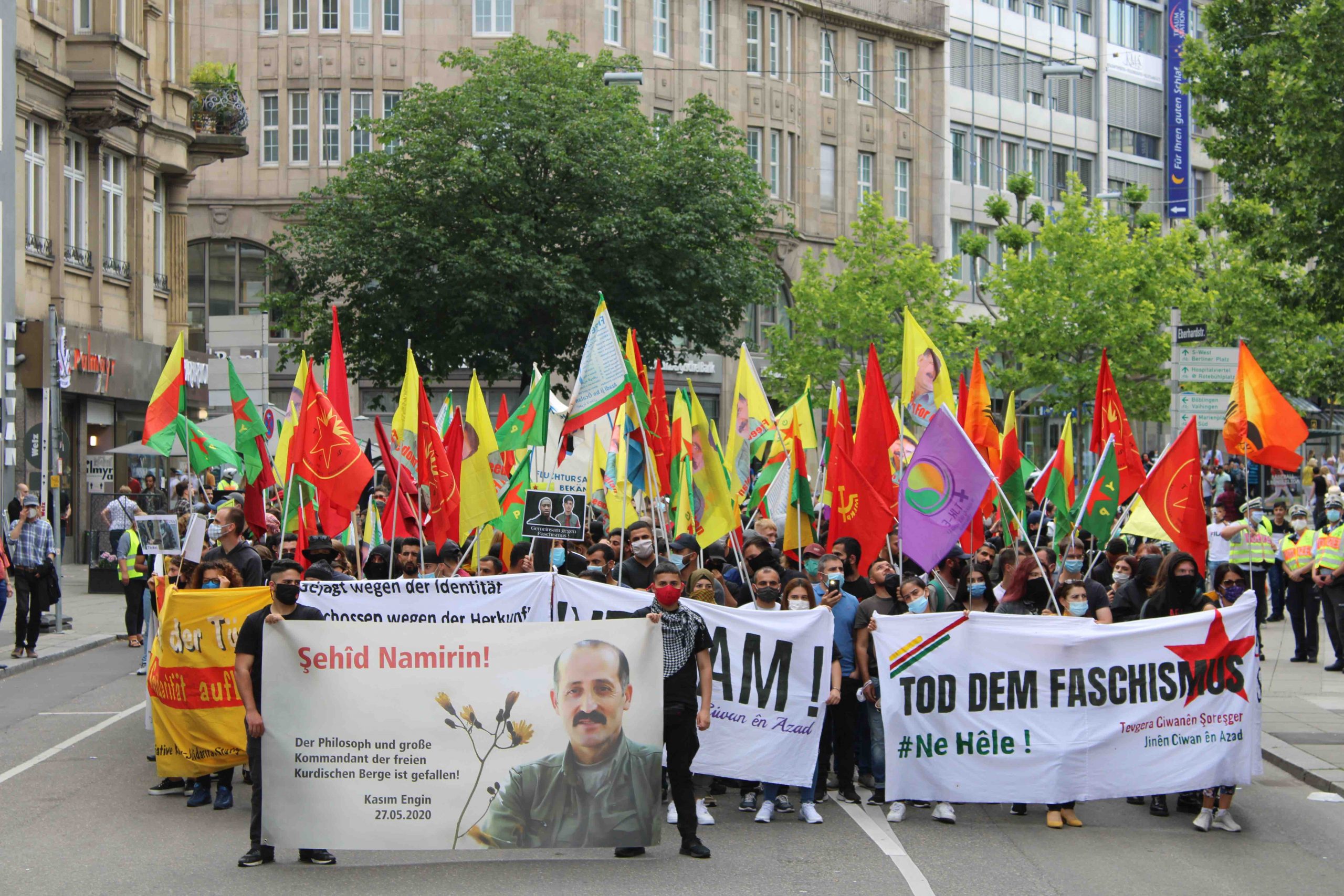 Nehêle hamlesi kapsamında yapılan eylem, 13 Haziran’da saat 15.30’da saygı duruşu ve Ey Reqîp marşı ile başladı. En önde işgalci Türk devletinin hava saldırısında şehit düşen PKK Merkez Komite üyesi Kasım Engin’in posteri ve ırkçı saldırılarda yaşamını yitiren Barış Çakar ve George Floyd’un resimleri taşındı. Halklar Önderi Abdullah Öcalan’ın posterleri, PKK, KCK, TCŞ ve JCA bayraklarının da açıldığı yürüyüşte kullanılan renkli dumanlar görsel açıdan dikkat çekiciydi. Gençler sık sık Almanca ve Kürtçe faşizme karşı sloganlar atarken, “Bijî Serok APO” ve “Şehîd Namirin” sloganları tüm sokaklarda yankılandı.