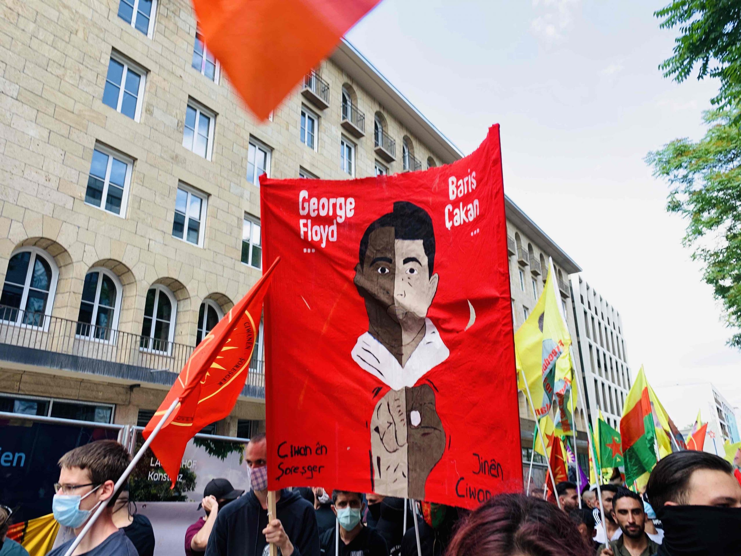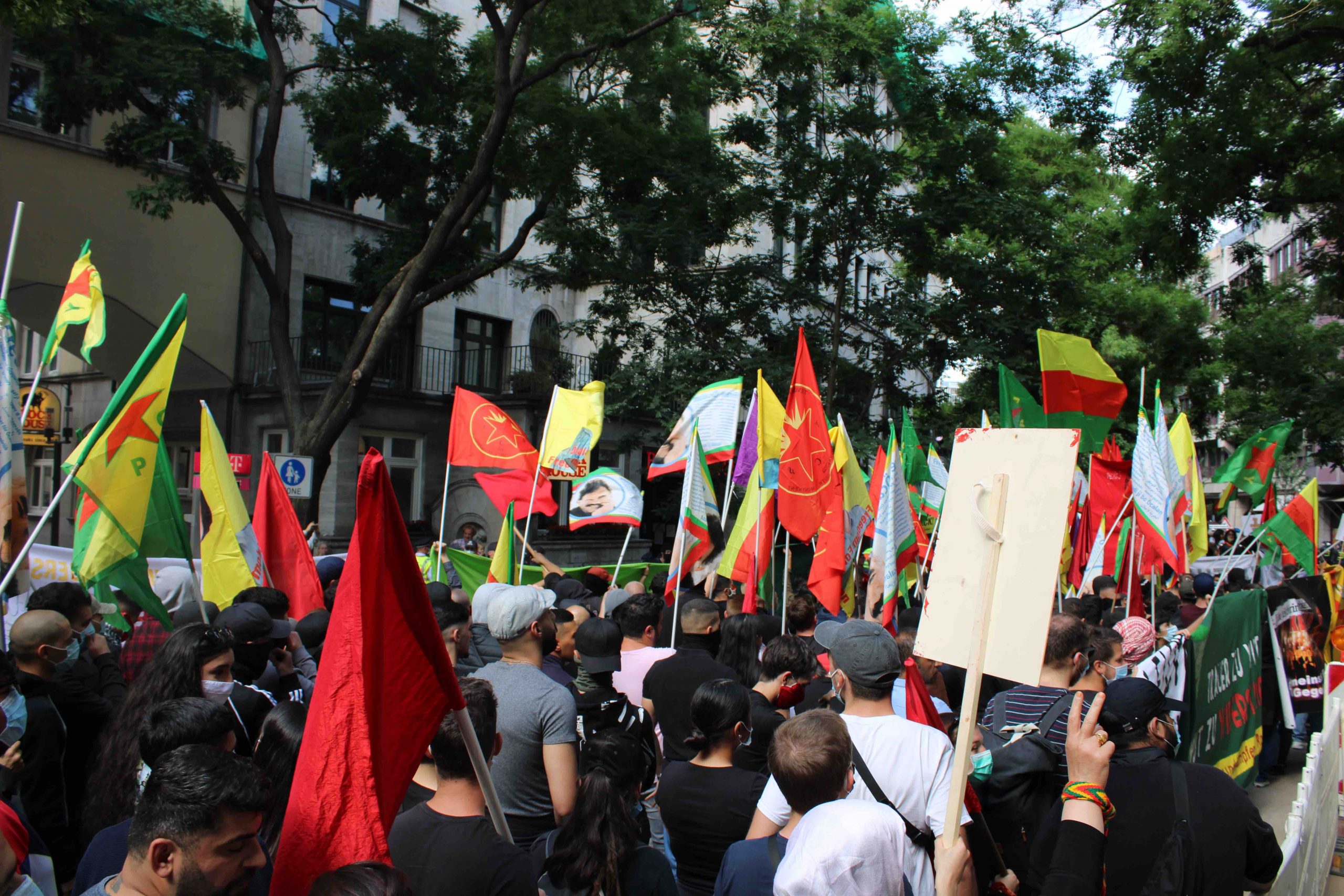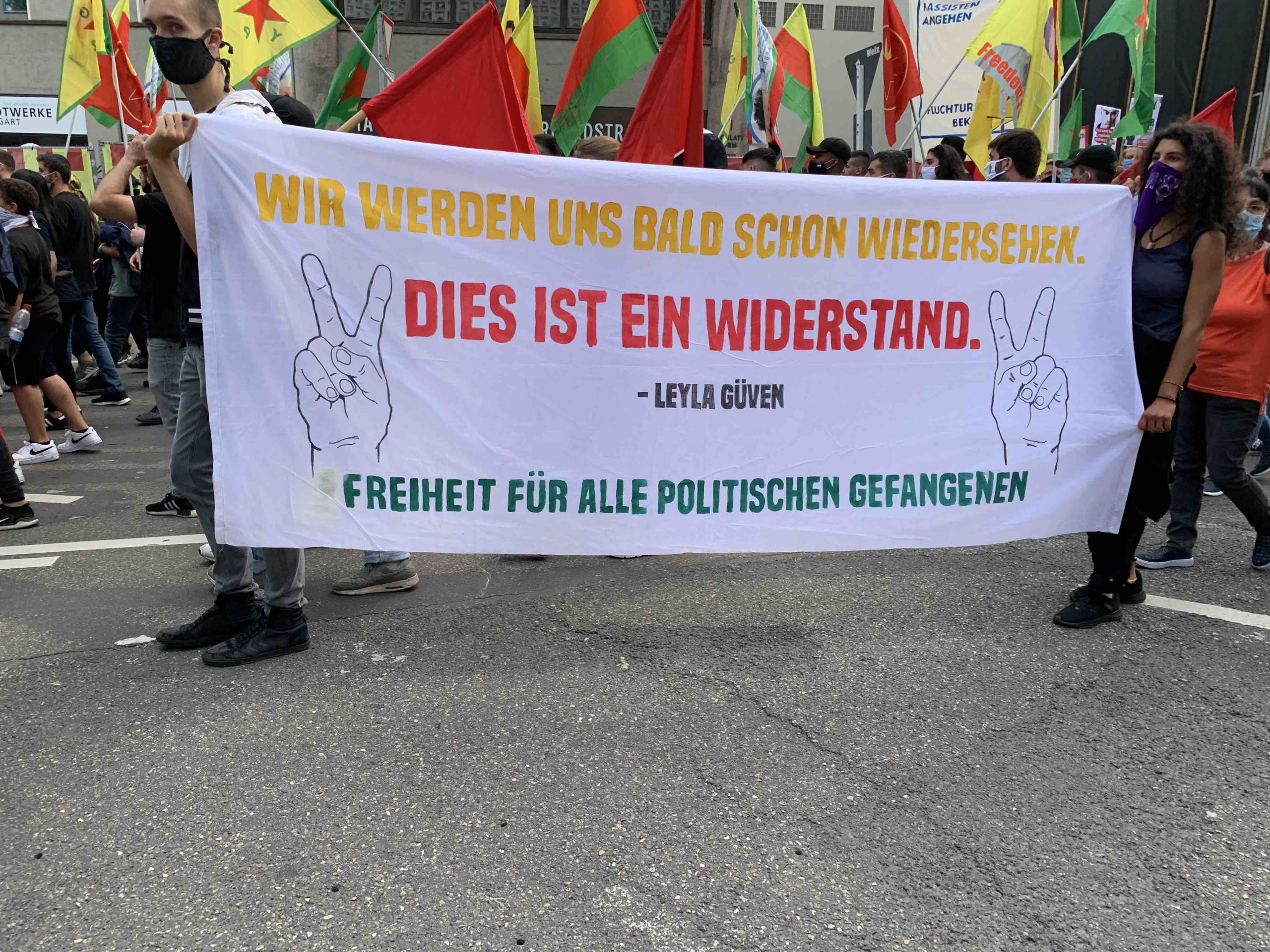 Nehêle hamlesi kapsamında yapılan eylem, 13 Haziran’da saat 15.30’da saygı duruşu ve Ey Reqîp marşı ile başladı. En önde işgalci Türk devletinin hava saldırısında şehit düşen PKK Merkez Komite üyesi Kasım Engin’in posteri ve ırkçı saldırılarda yaşamını yitiren Barış Çakar ve George Floyd’un resimleri taşındı. Halklar Önderi Abdullah Öcalan’ın posterleri, PKK, KCK, TCŞ ve JCA bayraklarının da açıldığı yürüyüşte kullanılan renkli dumanlar görsel açıdan dikkat çekiciydi. Gençler sık sık Almanca ve Kürtçe faşizme karşı sloganlar atarken, “Bijî Serok APO” ve “Şehîd Namirin” sloganları tüm sokaklarda yankılandı.