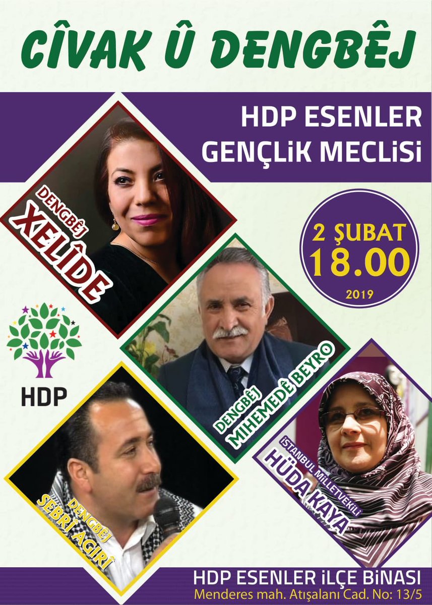 HDP Amed Milletvekili Dersim Dağ, gençlere seslenerek 2 şubat saat 18 :00’de HDP Esenler ilçe binasında yapacakları şölene davet etti.