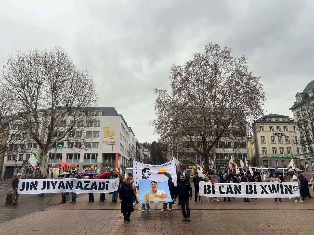 Yürüyüş boyunca atılan “Bijî Serok APO”,” Bijî Berxwedana Rojava” ve “Bijî Berxwedana YPJ” sloganları, Stuttgart caddelerinde yankılandı.