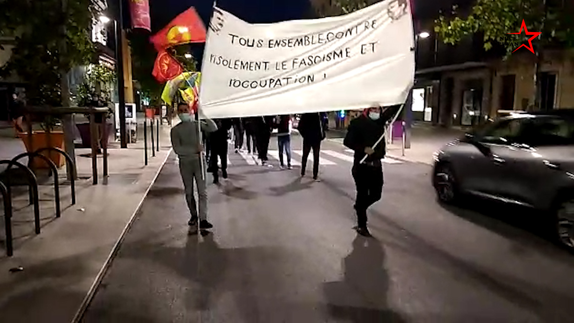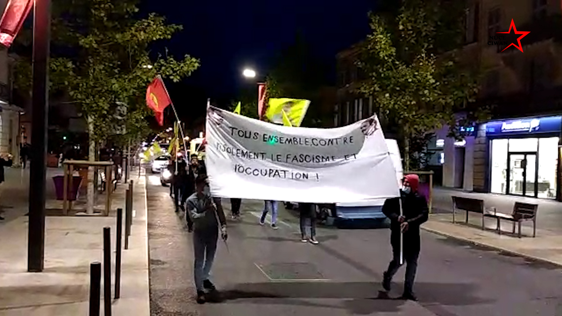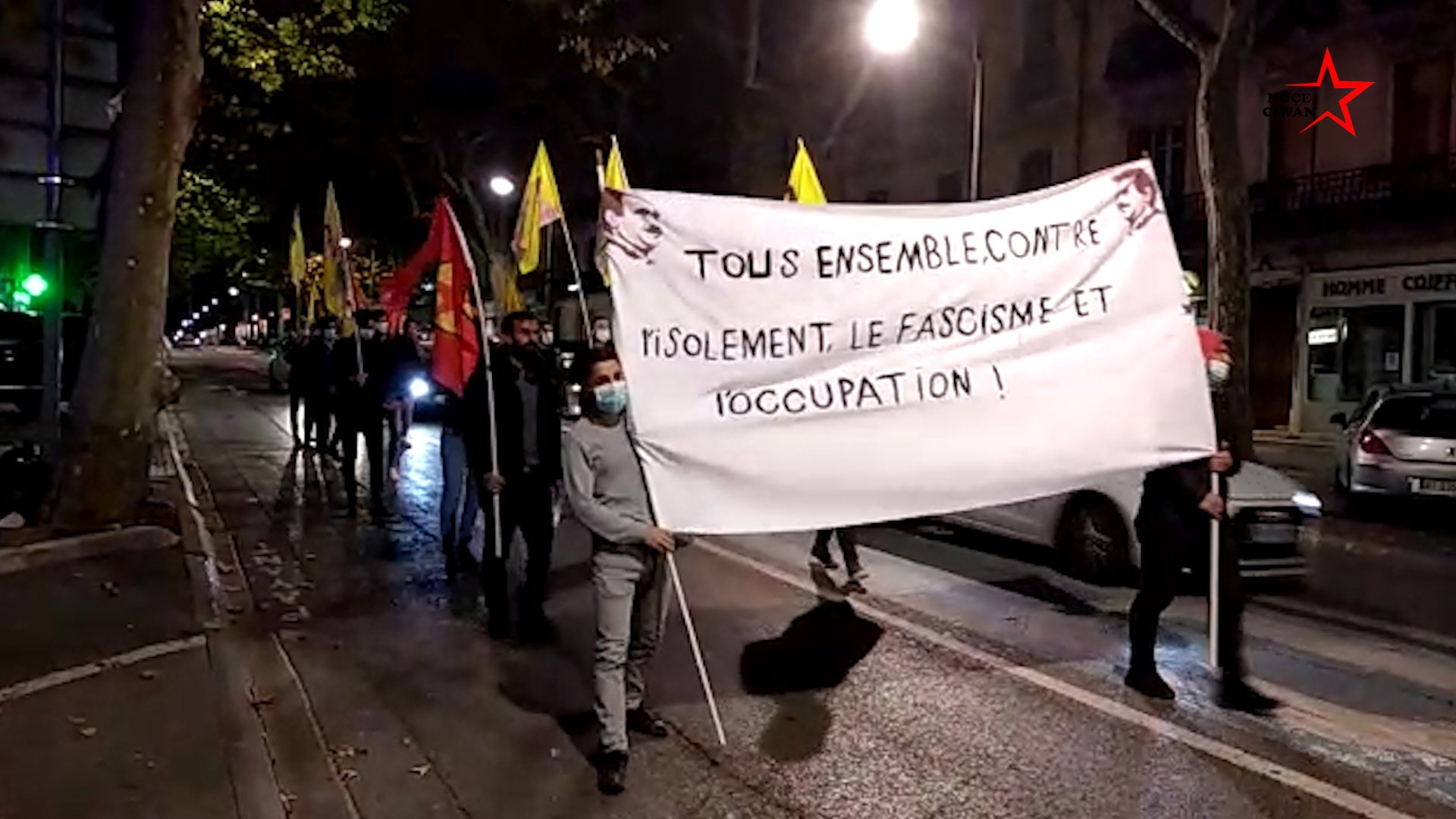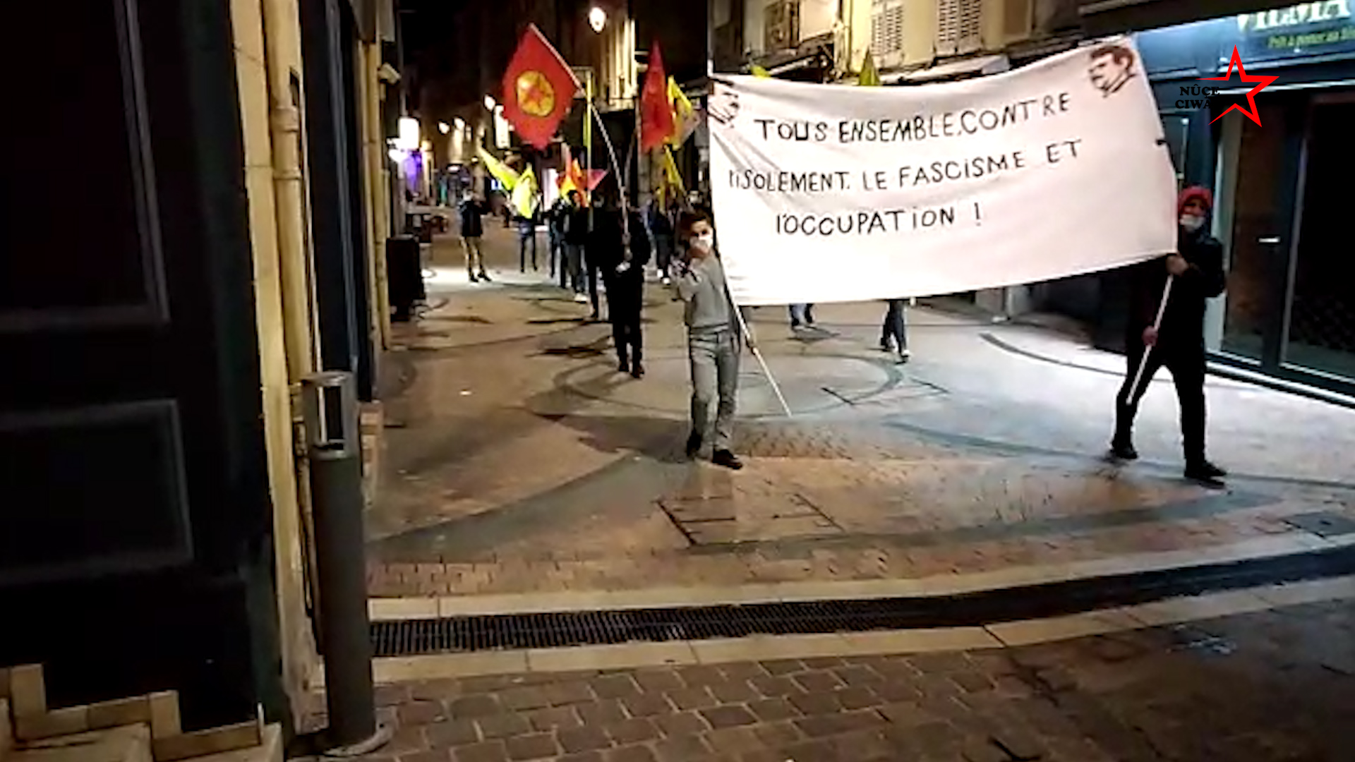 Eylem, saat 20’de şehir merkezinde gençlerin toplanması ile başladı. Fransızca, “Tecride, Faşizme, İşgale Son: Birlikte Serhildan” yazan bir pankart ile yürüyen gençler, sık sık “Bijî Serok APO”, “Öcalansız Dünyayı Başınıza Yıkarız”, “Assassin (Katil) Erdogan” sloganlarını attı. Gençler, şehir içerisindeki birçok noktada yürüyüşlerini sürdürürken, aynı zamanda eylemin amacına dair hazırladıkları Fransızca bildirileri de çevredeki insanlara dağıttılar.