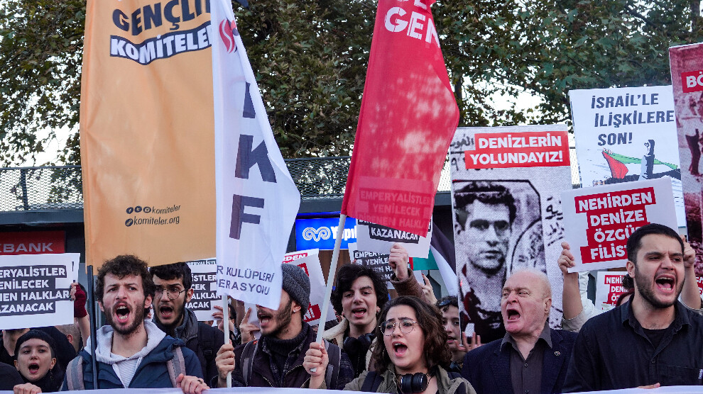 İSTANBUL – Gençlik Komiteleri, Öğrenci Kolektifleri, FKF, Devrimci Gençlik Dernekleri, Sol Gençlik’ten oluşan altı gençlik örgütü, siyonist İsrail devletinin Filistin halkına yönelik soykırım ve göç ettirme saldırılarını Fındıklı’dan, Deniz Gezmiş’lerin 6. Filo’yu denize döktüğü Dolmabahçe’ye yürüyerek protesto etti.