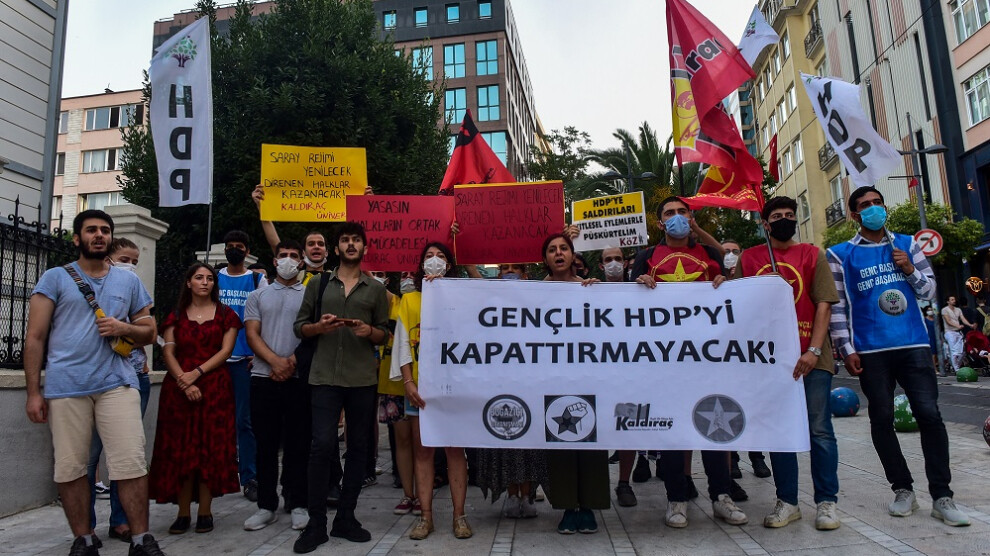 İSTANBUL – Halkların Demokratik Partisi’ne (HDP), Yeni Demokrat Gençlik, Kaldıraç, Gençlik Komünleri, Boğaziçi Dayanışması’ndan oluşan dört gençlik örgütü, HDP’ye açılan kapatma davasını Kadıköy Süreyya Operası önünde protesto etti. Polis ablukası altında gerçekleşen eyleme HDP milletvekilleri Züleyha Gülüm ve Dersim Dağ katıldı. “Gençlik HDP’yi kapattırmayacak” yazılı pankartın açıldığı eylemde “HDP’ye saldırılar kitlesel eylemlerle püskürtülür”, “Saray rejimi yenilecek direnen halklar kazanacak” dövizleri taşındı. Sık sık, “HDP umuttur umut dimdik ayakta”, “Bijî berxwedana HDP” sloganlarının atan gençlik örgütleri adına açıklamayı Arda Yüksel okudu.