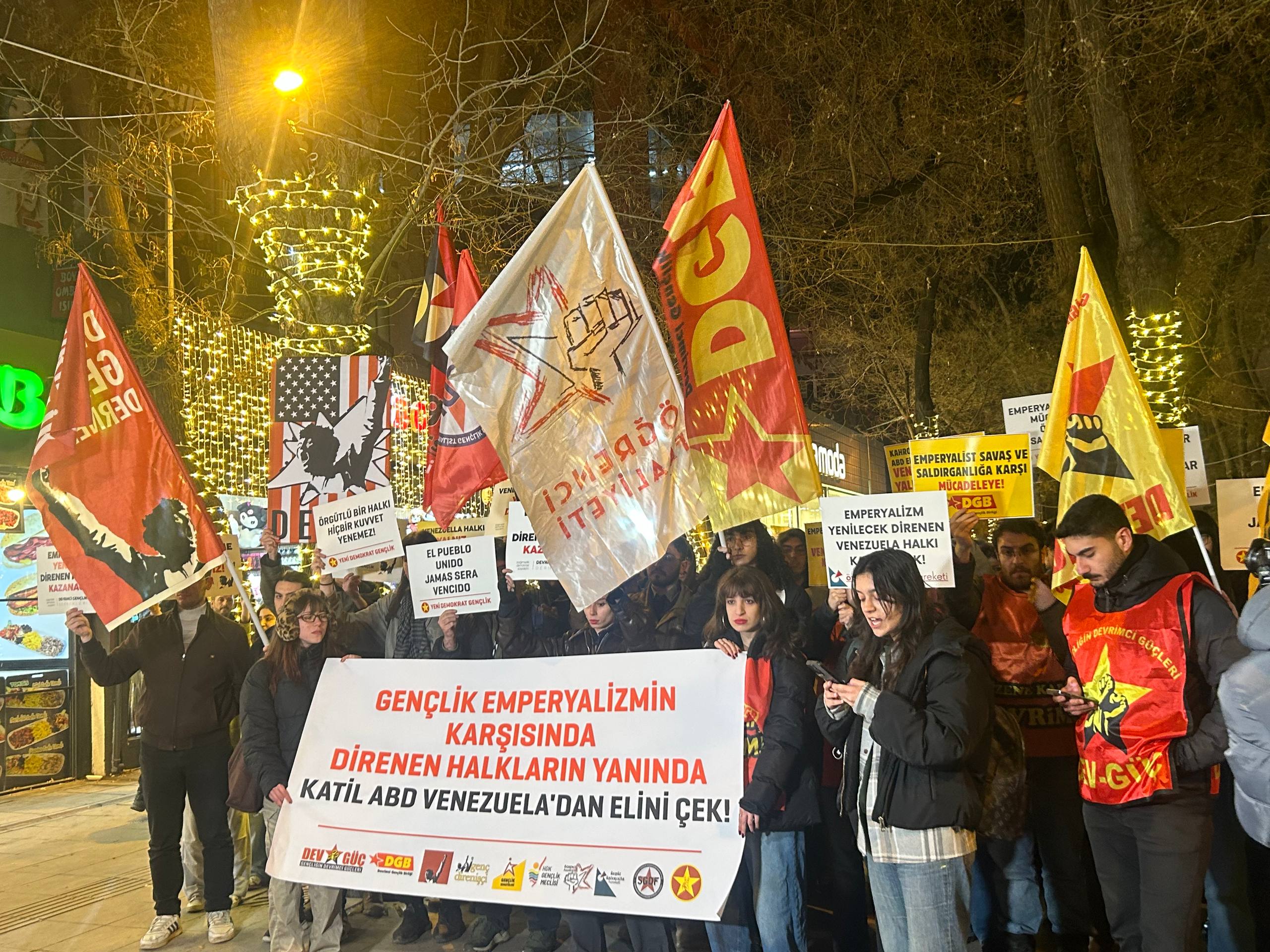 Ankara’da bir araya gelen gençler Yüksel Caddesi’nde, ABD’nin Devlet Başkanı Nicolas Maduro’nun kaçırılmasıyla sonuçlanan Venezuela’ya yönelik askeri saldırısını protesto etti.
