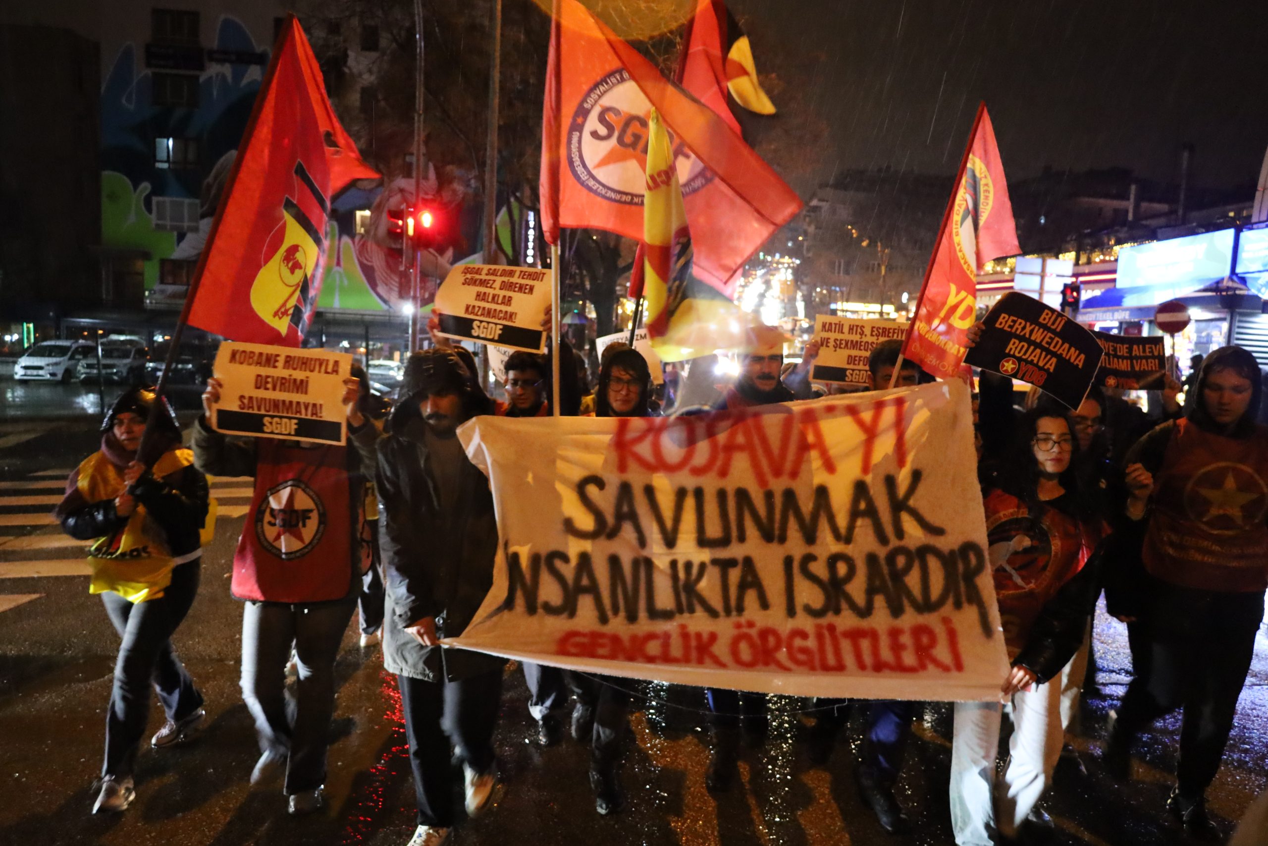 Çankaya İlçesi, Kızılay semtinde bulunan John F. Kennedy Caddesi’nde başlayan yürüyüş, Atatürk Bulvarında devam etti. “Rojava’yı savunmak insanlıkta ısrardır” pankartı ile yürüyen gençler, bulvarı trafiğe kapattı.