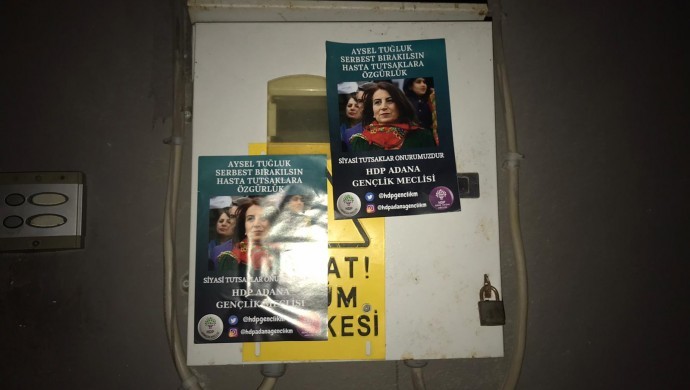 Seyhan ilçesinin Gülbahçe Mahallesi’nde evlerin kapılarına ve duvarlara, “Aysel Tuğluk serbest bırakılsın, hasta tutsaklara özgürlük”, “Siyasi tutsaklar onurumuzdur”, “Gençlik tecridi kıracak faşizmi yıkacak, özgür yarınları kuracak” ile “Tecridi kıralım faşizmi yıkalım” yazılı stickerler yapıştırdı.