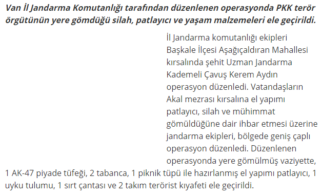 Medya da servis edilen habere göre; Van’da işgal operasyonuna çıkan Türk ordusu, yere gömülü, “1 AK-47 piyade tüfeği, 2 tabanca, 1 piknik tüpü ile hazırlanmış el yapımı patlayıcı, 1 uyku tulumu, 1 sırt çantası ve 2 takım elbise” buldu. Ve bunu medyaya “PKK’ye büyük darbe” başlığıyla servis etti.