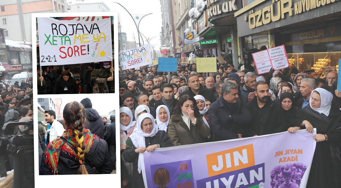 Demokratik Kurumlar Platformu (DEKUP) öncülüğünde, Colemêrg’in (Hakkari) Gever (Yüksekova) ilçesinde HTŞ, DAİŞ ve Türkiye destekli çeteler tarafından Rojava’ya yönelik gerçekleşen saldırılara karşı yürüyüş gerçekleştirildi. Halkların Eşitlik ve Demokrasi Partisi (DEM Parti) Gever İlçe Binası önünde bir araya gelen binlerce insan “Bîjî berxwedana Rojava” sloganları eşliğinde Zagros İş Merkezi’ne kadar yürüdü.