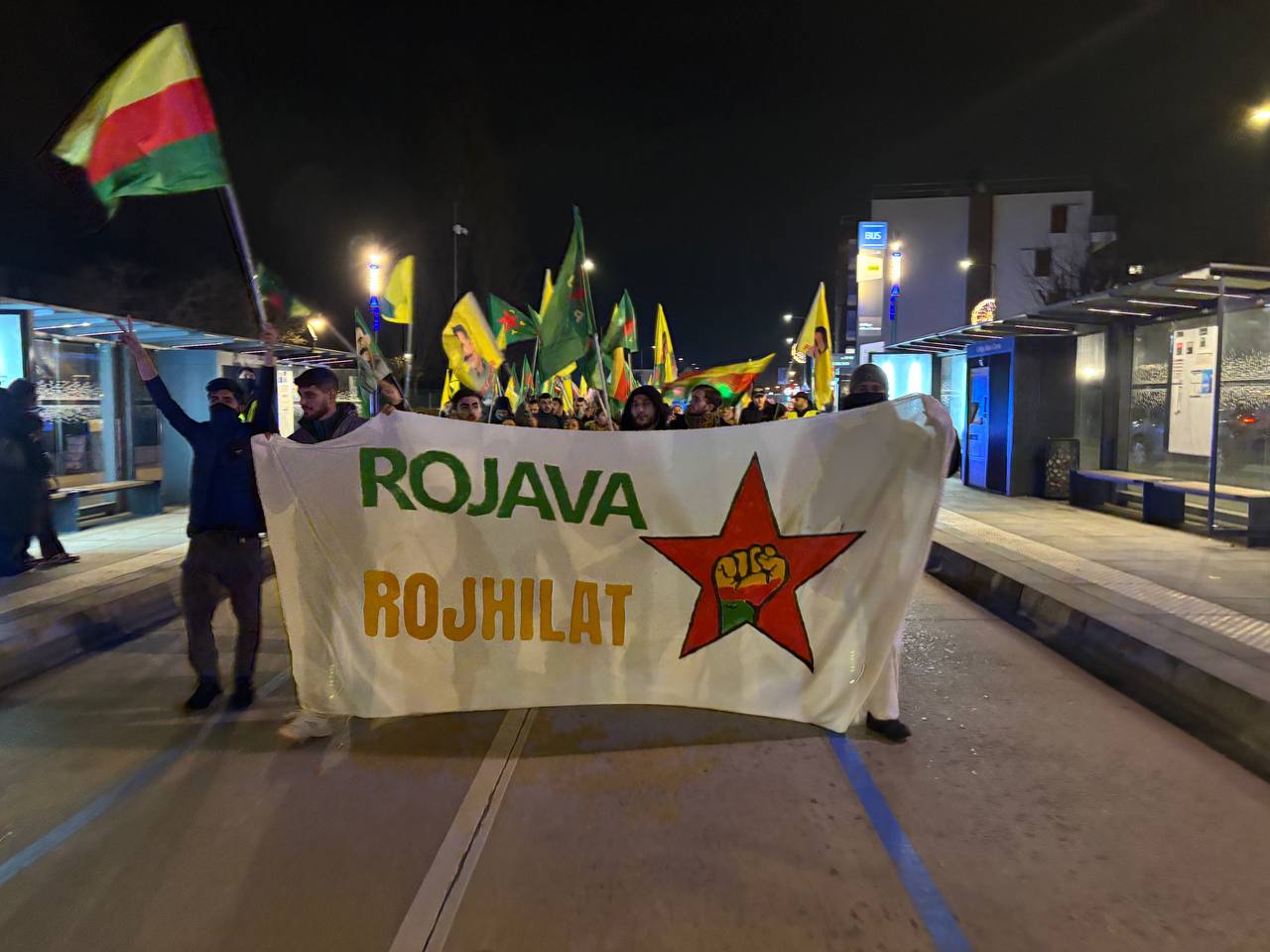TCŞ üyesi gençler HTŞ ve Türk devleti çetelerinin saldırılarına karşı seferberlik ilan edilen Rojavada destek amaçlı yapılan eylemde polis engelliye karşılaşan gençler engel tanımadan yürüyüşlerine Grigny Kürt kültür derneğinden başlayarak tren istasyonuna kadar sloganları ile yapılan saldırıları kınayarak yürüşlerine devam etti.