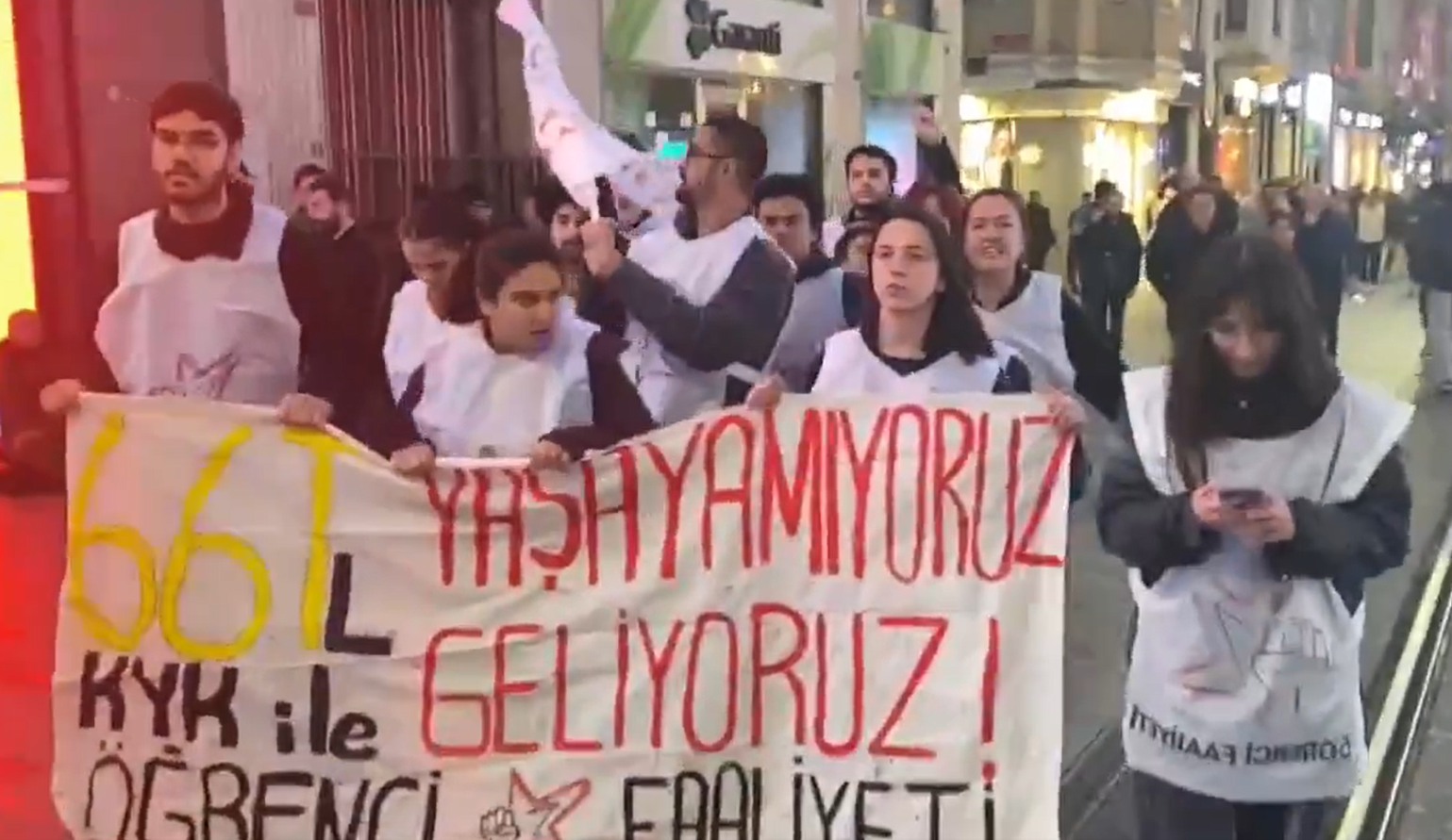 “Geleceğimiz yoksa korkumuz da yok” sloganıyla İstiklal Caddesi’ne “66 TL KYK ile yaşayamıyoruz, geliyoruz” yazılı pankartı taşıyarak giriş yapan üniversiteliler bir süre yürüdükten sonra polis tarafından ablukaya alındı. Bir süre polis ablukasını aşmaya çalışan üniversiteliler darp edilerek gözaltına alındı. Üniversiteliler gözaltına alınırken “AKP’den hesabı gençlik soracak” sloganları attı.