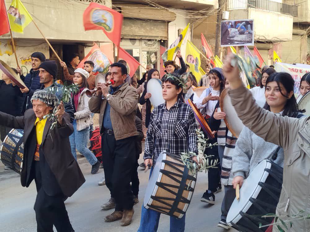 Binlerce kişinin katıldığı yürüyüş saat 13.00’te başladı ve Şeyh Maksud mahallesinin tamamını yürüyüşe katılan kitle doldurdu. Halk, QSD’ye destek için bayrak ve pankartlar açarak, “Bijî berxwedana QSD” ve “Bijî berxwedana Tişrîn” sloganları attı. Davul zurna eşliğinde halaya duran halk tüm mahalleyi boylu boyunca yürüdü.