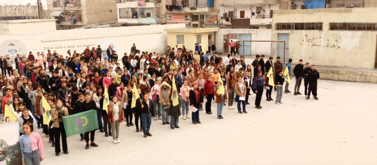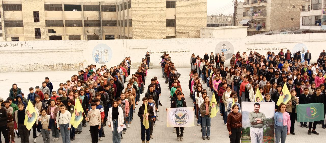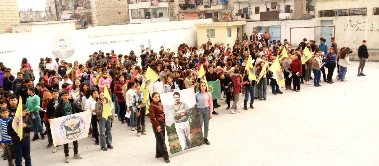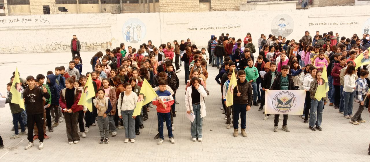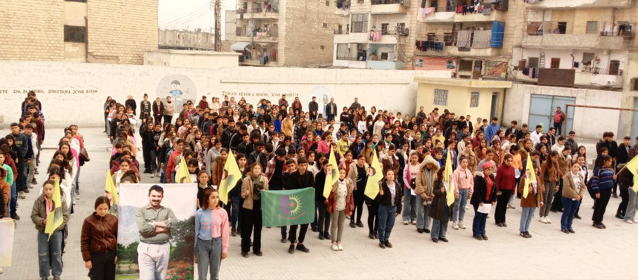 HALEP – Halep Şêx Maqsud Ortaokulu’nda öğrenciler Önder Apo’ya yönelik 15 Şubat 1999 yılında gerçekleştirilen uluslararası komplonun yıldönümünde hala devam eden komployu protesto etti.