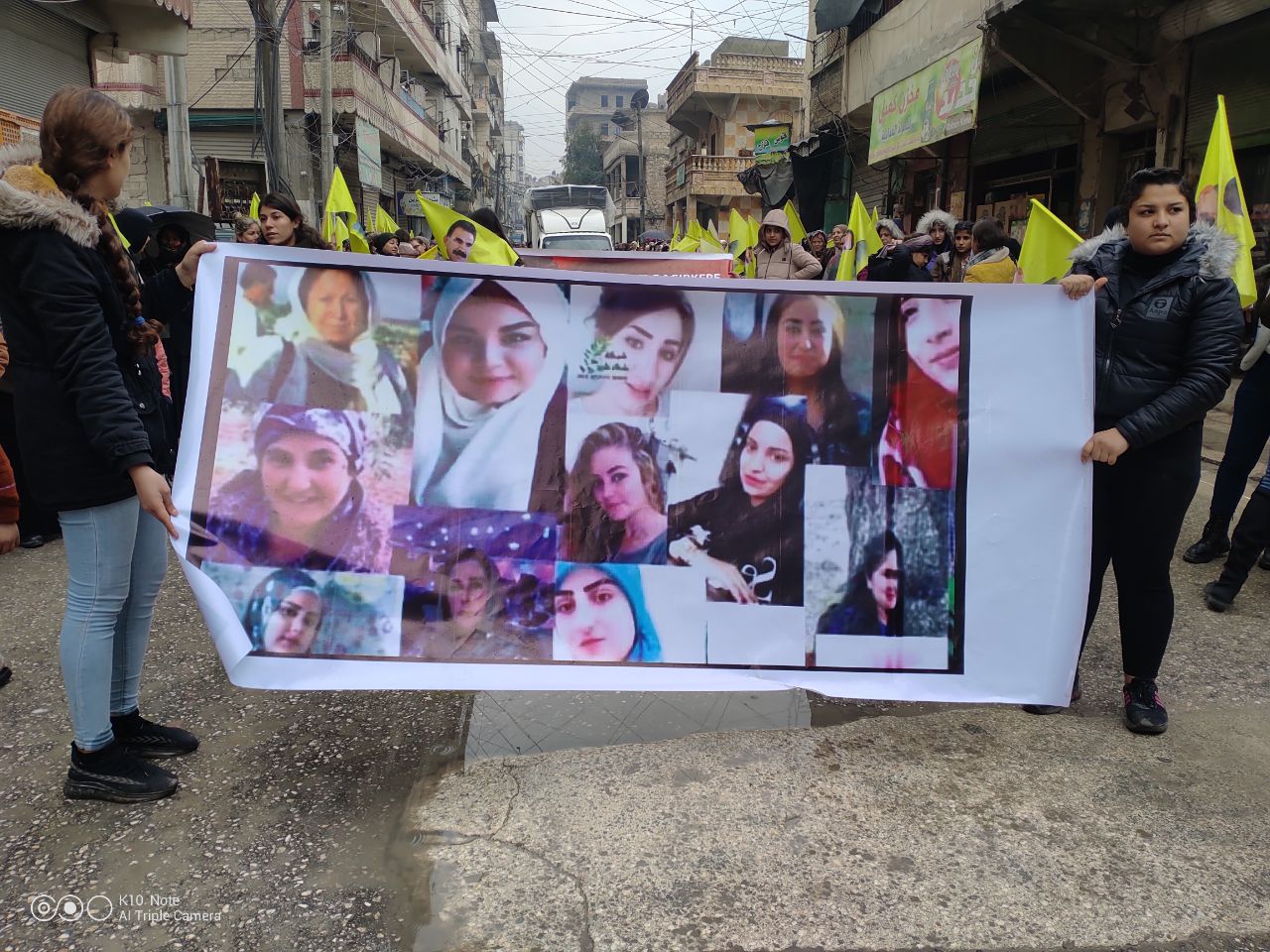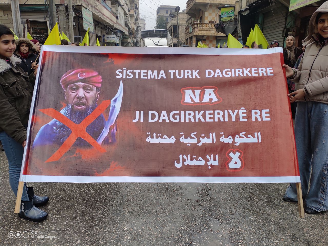 HALEP- Halep Genç Kadınlar Birliği, Türk devletinin Kuzey ve Doğu Suriye’ye yönelik saldırılarında 80 hizmet kurum ve kuruluşunun hedef alınmasına karşı ve Efrîn’de soykırımcı Türk Devletinin çeteleri tarafından kaçırılan, katledilen genç kadınlar olmak üzere Efrîn halkı için kitlesel bir yürüyüş düzenledi. Yürüyüşte genç kadınların yanı sıra Halep halkı da katıldı. Harbi mahallesindeki 8 Mart salonundan başlayan yürüyüş Sahaş mahallesine kadar devam etti. Yürüyüş boyunca Jin Jiyan Azadî, Bê Serok Jiyan Nabe sloganları atıldı. Ayrıca yürüyüş boyunca üzerinde “Rojava Devrimi Kadın Devrimidir, Kadınlar Devrimine Sahip Çıkıyor” “Türk Sistemi İşgalcidir, İşgale Hayır!” yazılı pankartlar ve Önderlik filemeları kaldırıldı.