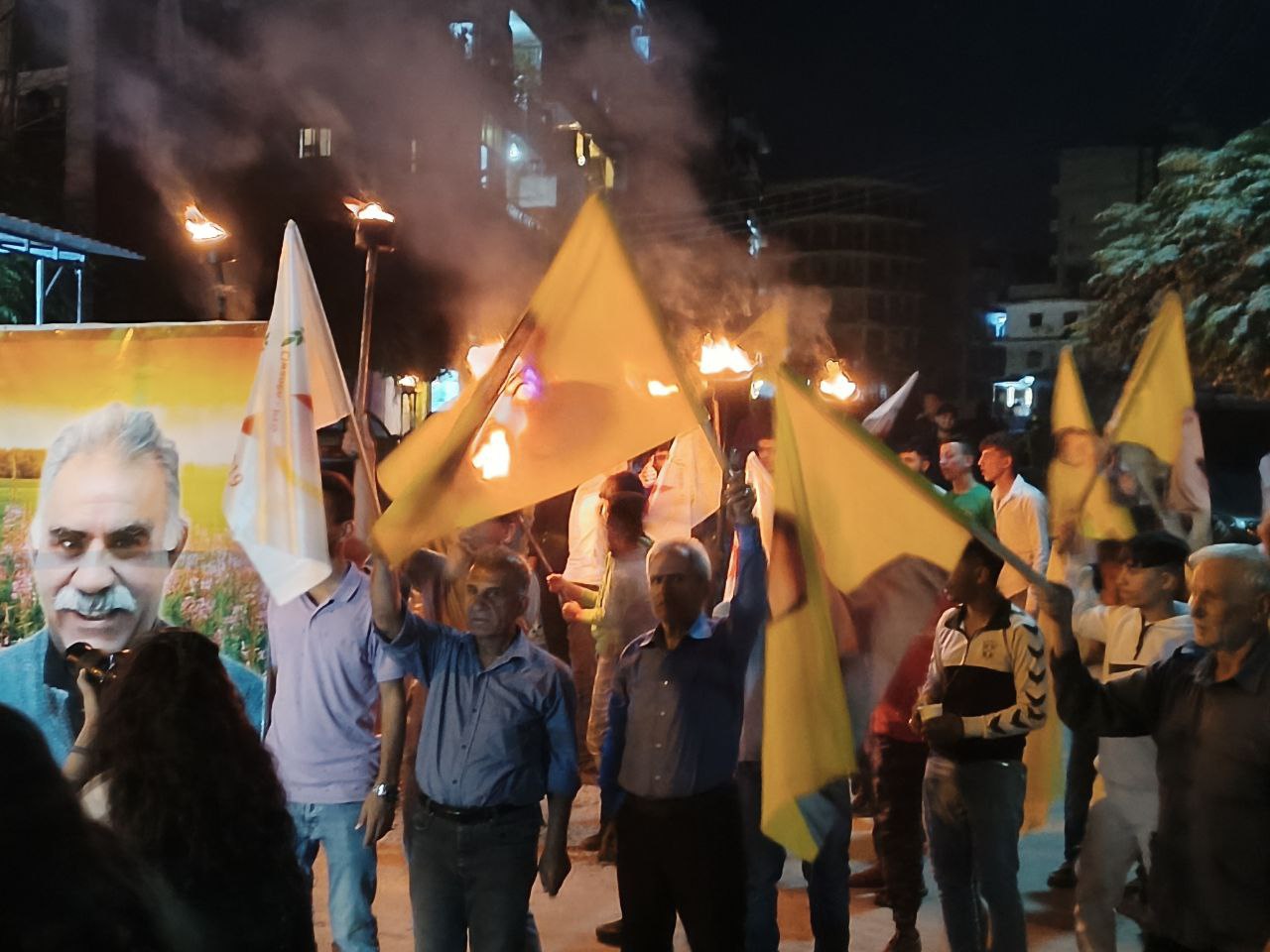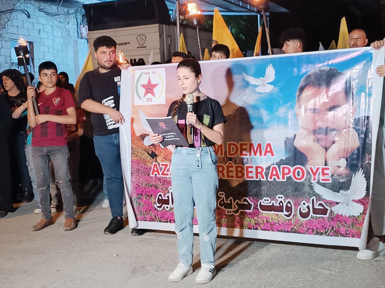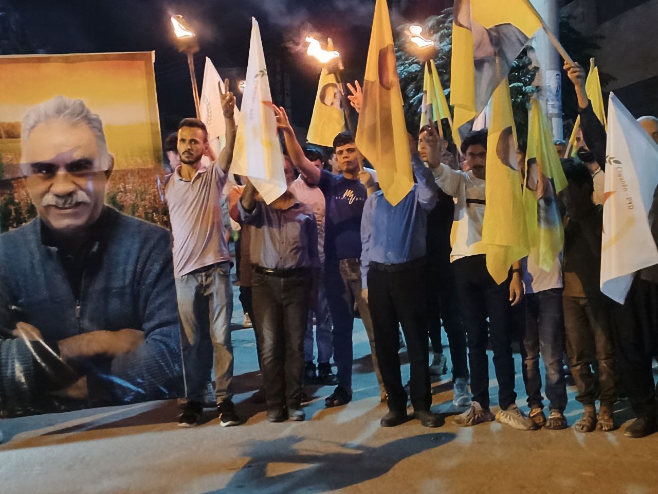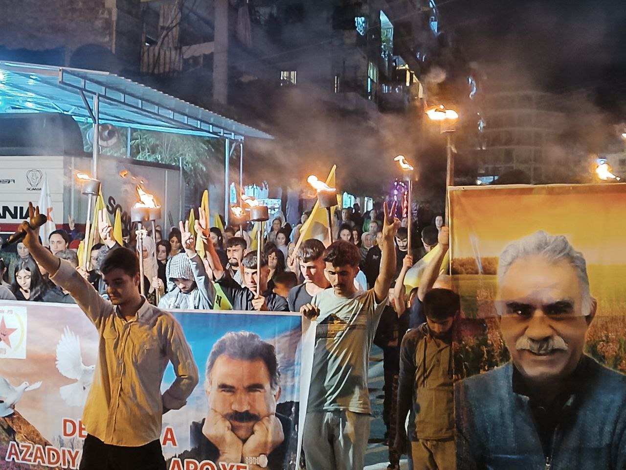 Yüzlerce genç ellerinde Önder APO’nun filemaları ve meşalelerle hep bri ağızdan “Bijî Serok APO” sloganıyla yürüdü.