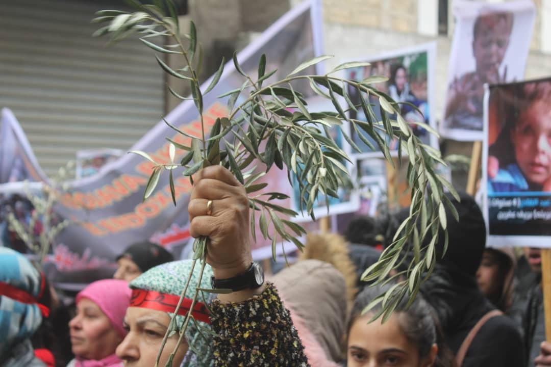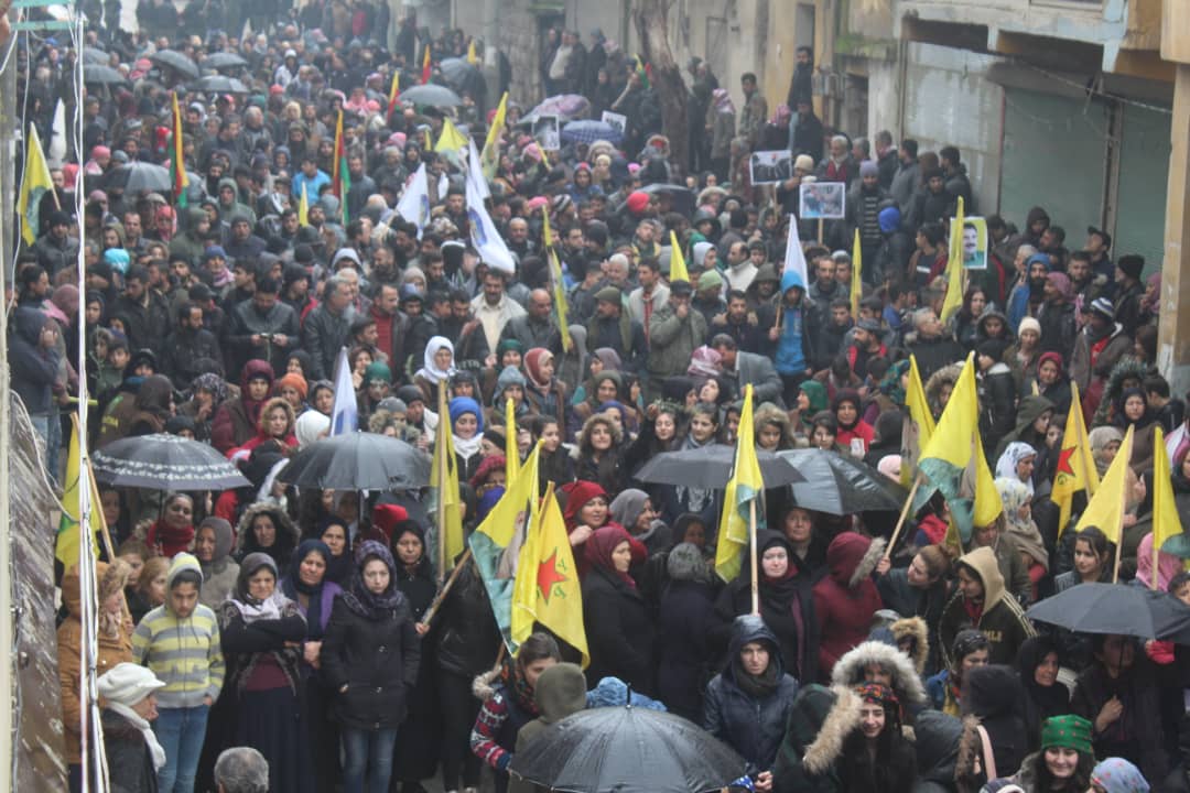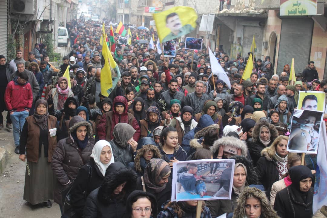 HALEP – Halep’in Şêxmeqsûd ve Eşrefiyê mahallelerinden binler, işgalci Türk devletinin Efrîn’e yönelik işgal saldırılarının yıldönümün de alanlara çıktı. Şêxmeqsûd Mahallesi’ndeki Qebû Yasîn Salonu önünde toplanan binler, YPG, YPJ, PYD ve Kongreya Star bayrakları ile üzerinde “Katil Erdoğan elini Rojava’dan çek” yazılı pankartla yürüyüşe geçti.