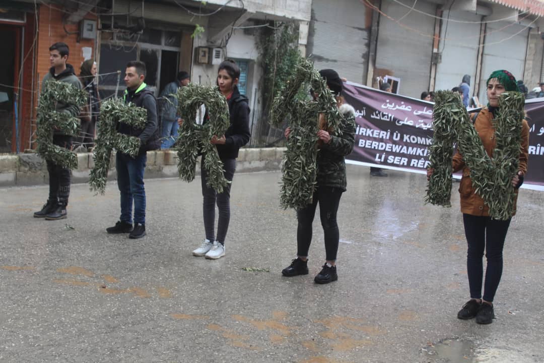 Sık sık işgal saldırılarına karşı direniş sloganlarının atıldığı yürüyüş Cibanat Meydanı’nda mitinge dönüştü. Burada PYD adına Xerîb Hiso ve MSD adına Fehîma Hemû konuştu. Efrîn’in özgürleştiği güne dek mücadeleyi sürdüreceklerini vurgulayan konuşmacılar, Türk devletinin yayılmacı işgal politikalarının önüne geçeceklerini söyledi.