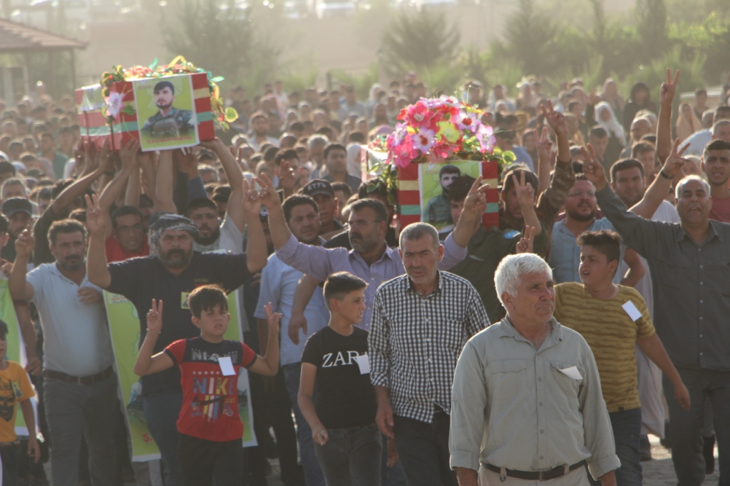 Saygı duruşuyla başlayan cenaze töreninde konuşan Fırat Bölgesi Çevre İdareleri Kurulu Eş Başkanı Arif Bali, “Burada toplandığımızda zafer bayrağını dalgalandırarak şehitlerimizin yeminlerini yerine getiriyoruz. Şehitlerin fedakarlıkları sayesinde bugün buradayız. Halkımızı ve şehit ailelerini şehitlerin bayrağını yükseltmeye çağırıyoruz” dedi.