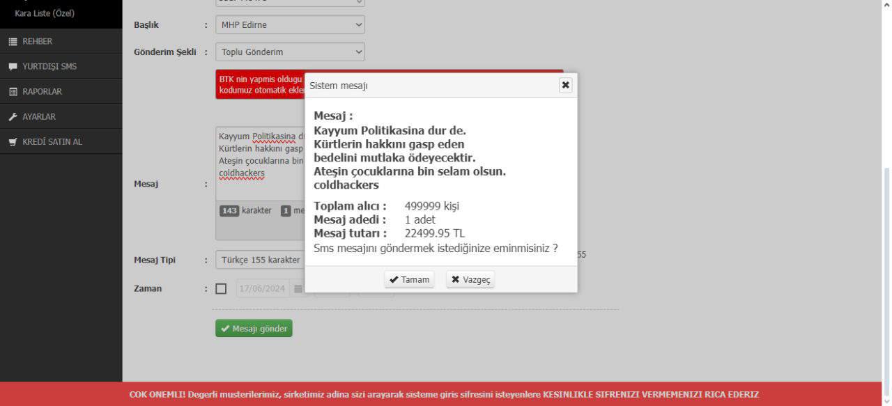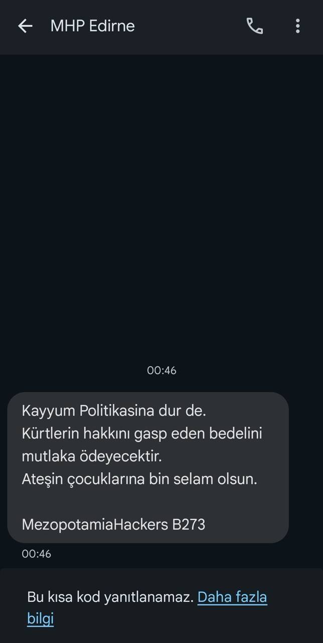 Mesaj sistemini ele geçiren Halkın Siber Ordusu üyeleri, MHP Edirne İl Başkanlığı adına ottuz bin kişininin telefonuna “Kayyum Politikasına dur de! Kürtlerin hakkını gasp eden bedelini mutlaka ödeyecektir” mesajını gönderdi.