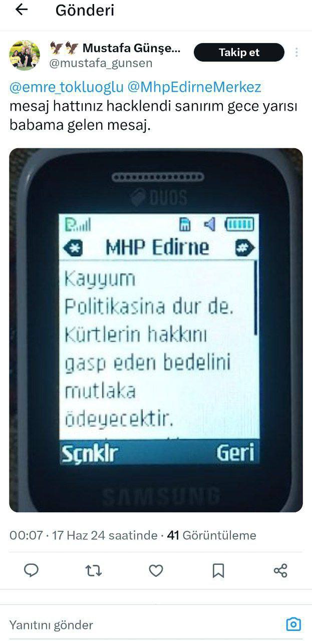 Edirne MHP teşkilatından gönderilen SMS’ler, bu haksızlıklara karşı siber direnişimizin bir ifadesidir. Halkımızın iradesini yok sayanlara cevabımız nettir: Kürt halkı boyun eğmeyecek, her alanda direnişini sürdürecektir.