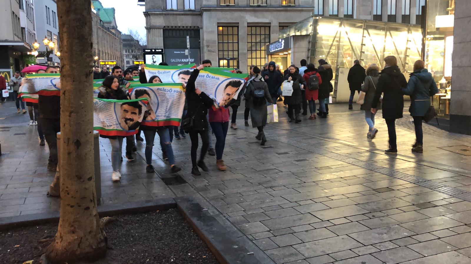 Kürdistanlılar bu akşam Almanya’nın Düsseldorf şehrinde Leyla Güven’le dayanışmak ve tecridin kaldırılmasını talep etmek için eyleme geçti. Halklar Önderi Abdullah Öcalan’ın bayraklarının taşınmasına Alman polisi izin vermedi. Bunun üzerine Kürt gençleri Halklar Önderi’nin bayraklarıyla şehir merkezinde eyleme geçti.