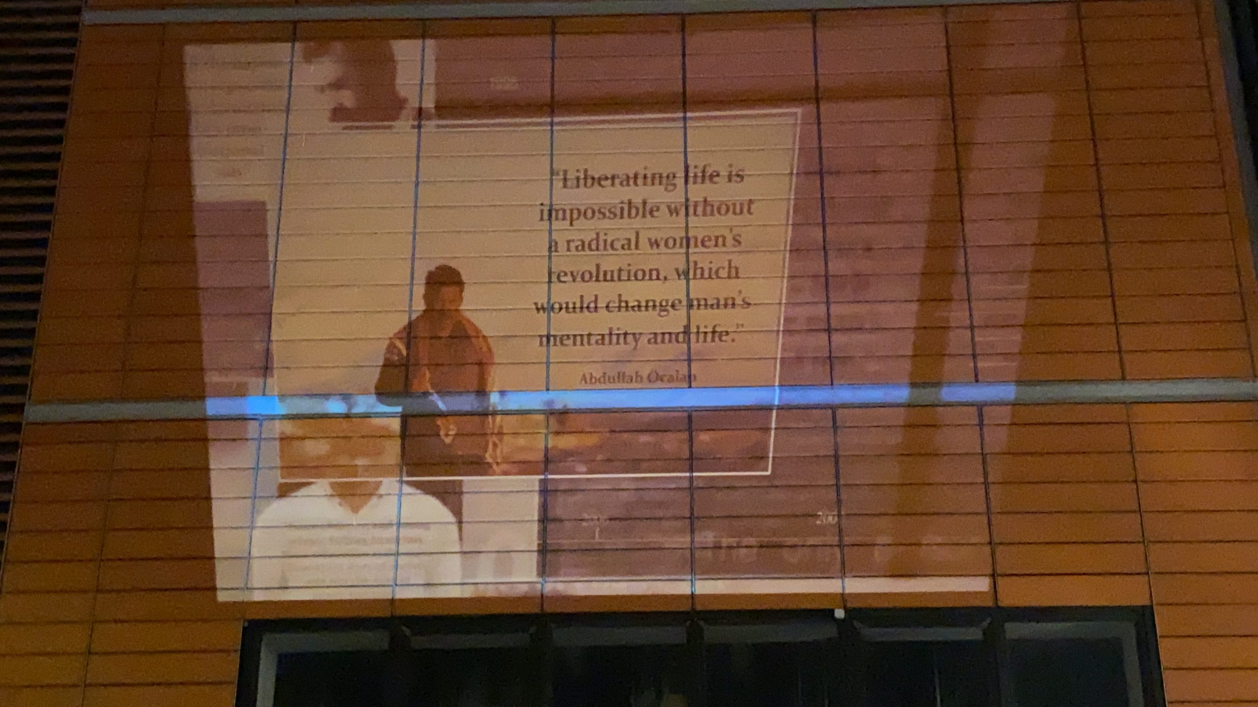 Alman Konsolosluğunu’nun yanındaki binaya Önder Öcalan’ın kadın özgürlüğü, kapitalist modernite ve PKK’yi anlatan değerlendirmelerinin olduğu video yansıtılırken, bunun yanı sıra gençler çok sayıda bildiri de dağıttı.