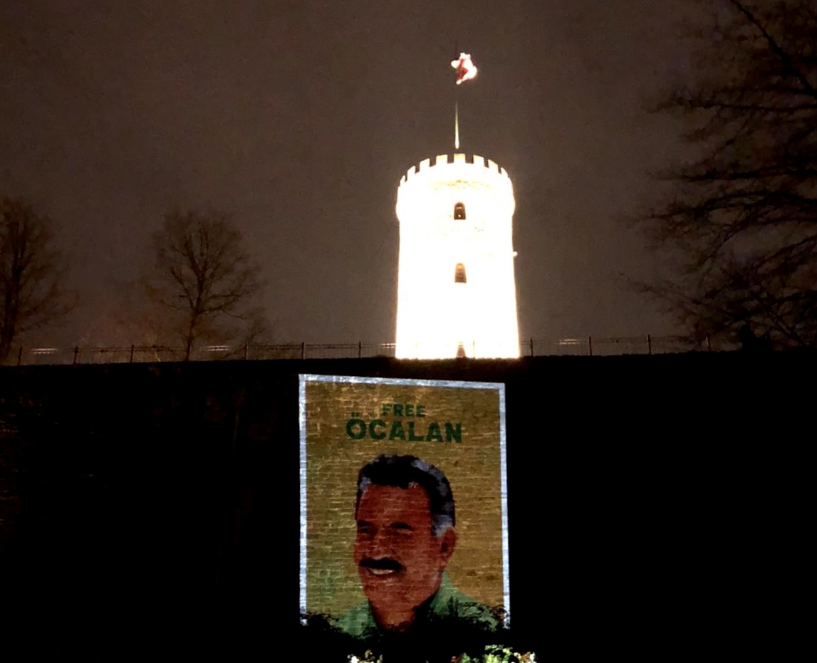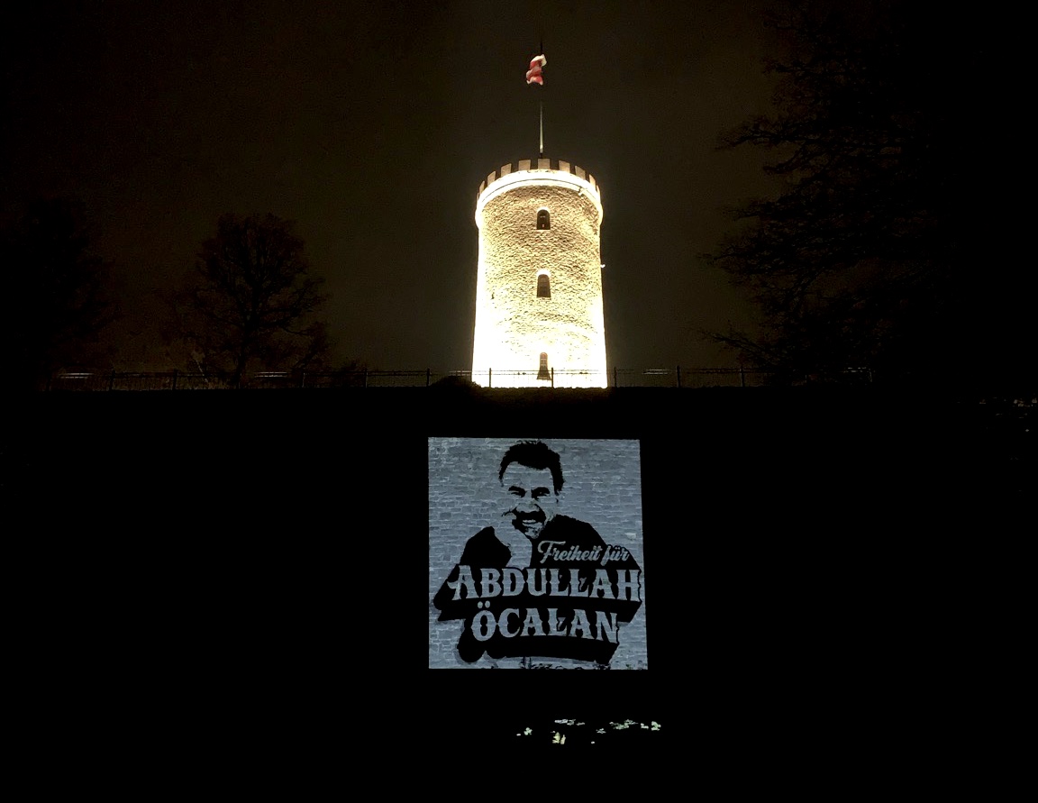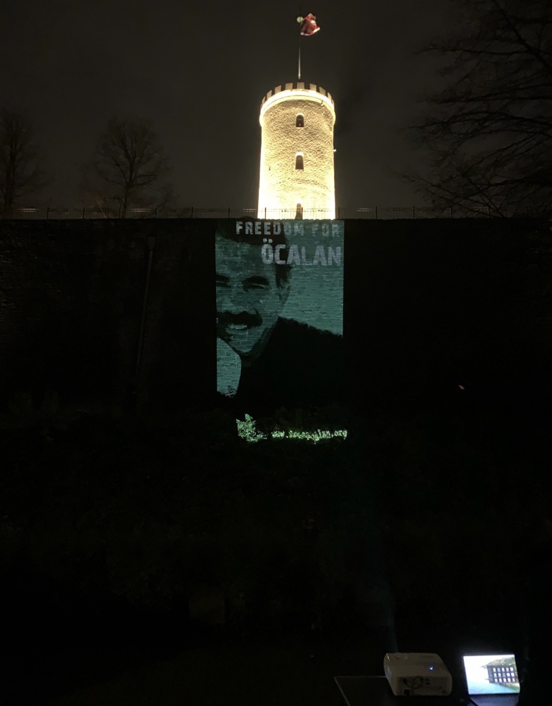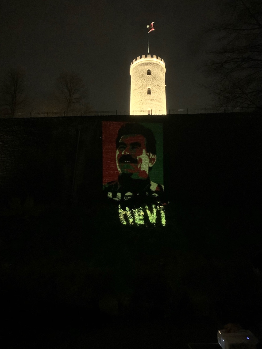 Almanya’nın Bielefeld kentinde Çarşamba günü akşam saatlerinde şehrin birçok kamu ve turistik kurumlarına Önder Öcalan’ın fotoğrafları projeksiyon ile yansıtıldı. Bielefeld belediye binası, Bielefeld’in ünlü turistik yeri olan Sparrenburg, Kunsthalle Bielefeld, Kesselbrink ve Ravensberger Parkı’na fotoğrafları yansıtan gençler, çevredeki eyleme ilgi gösteren insanlara eylemlerinin amacıyla ilgili bilgi de verdiler.