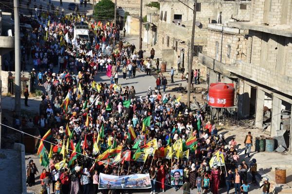 Efrîn ve Şehba bölgesinden binler, Rojava Devrimi’nin 7’nci yıldönümünü kutlamak amacıyla Şehba’nın Til Qerah köyünde bir araya geldi. Üzerinde “19 Temmuz ruhu ile faşizmi yok edeceğiz ve Efrîn’i özgürleştireceğiz” ve “19 Temmuz özgürlük ve barışın temelidir” yazılı pankartlar ile Halklar Önderi Abdullah Öcalan’ın posterleri ile yürüyüşe geçti.