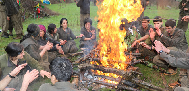 Bir grup gerilla ateşin etrafında ısınıyordu, bir grup da halay çekiyordu. Çayların ısınmasıyla bardaklar sırayla elden ele tüm gerillalara ulaştı. Elbiseleri ıslanan gerillalar çaylarını büyük bir hoşnutluk ve keyifle yudumladılar. Ateşte yapılan çayın tadı da bir başka oluyordu. Tabii gerillalar için bugün her zamandan daha bir anlamlıydı. Hepsinin gözlerindeki o heyecanı görebiliyordum. Işıl ışıldı gözleri. Çaylarını içen gerillalar yuvarlak çember etrafında toplanıp bugünün anlam ve önemine değindiler: