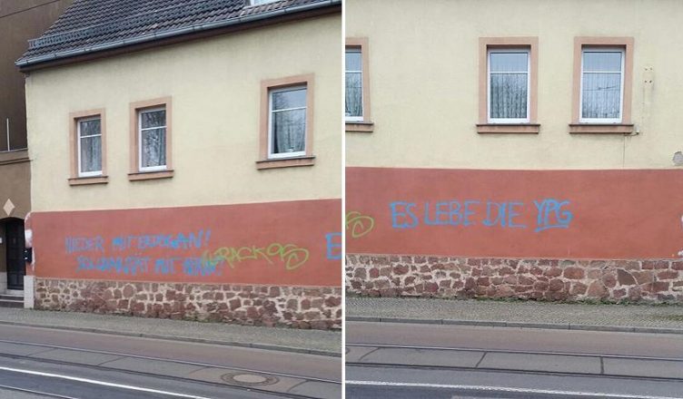 HALLE AN DER SAALE- Halle an der Saale’de Efrîn’le dayanışma içinde bulunan bir grup genç, Halle’de bulunan DİTİB merkezine eylem düzenledi. işgalci faşist Türk devletine bağlı olarak bilinen DİTİB merkezinde aktivistler, mavi boya ile DİTİB merkezinin duvarlarına “Alçak Erdoğan”, “Efrin ile Dayanışma” ve “Yaşasın YPG ve Önder APO” yazdılar.