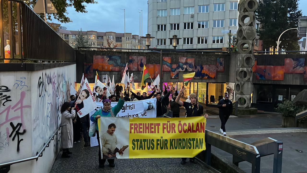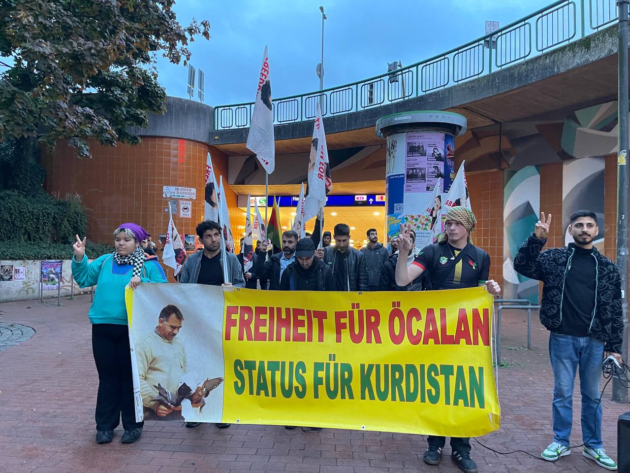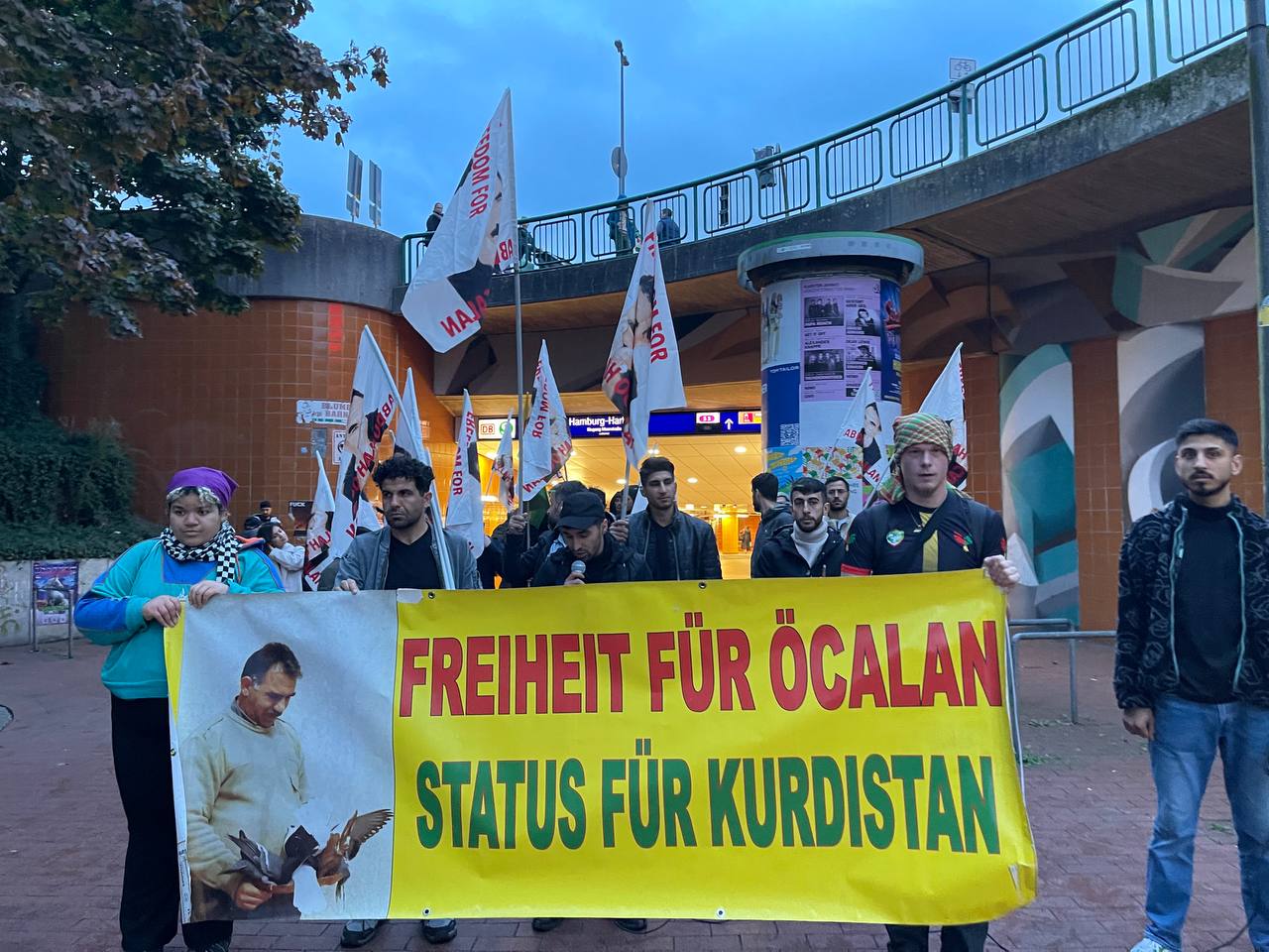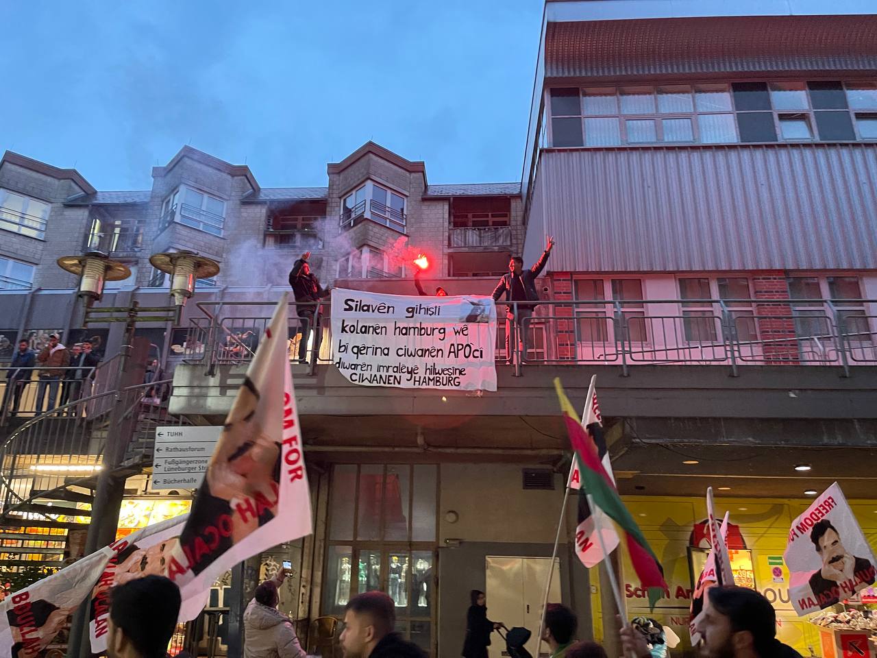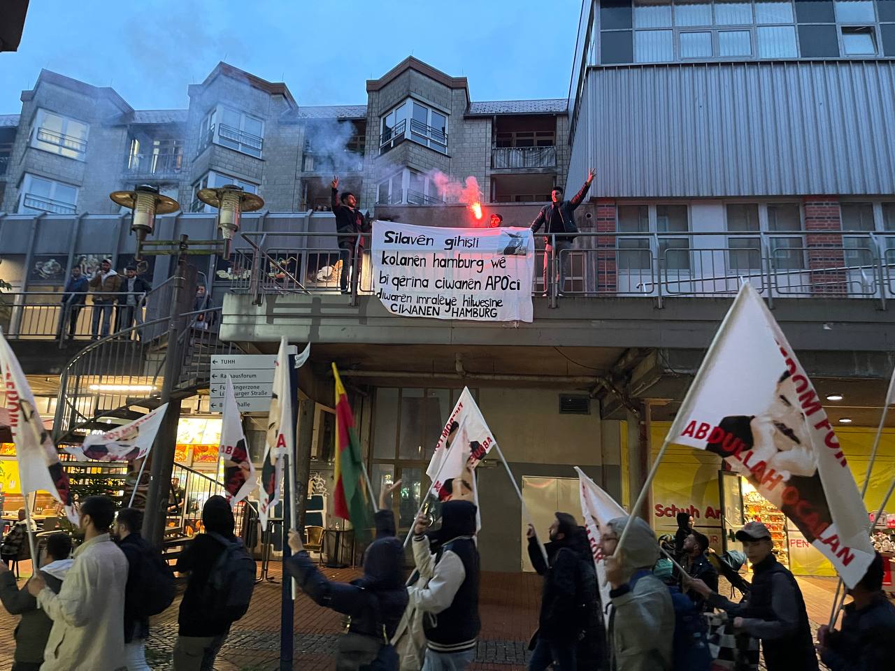 Eylemde, PKK Yürütme Komitesi Üyesi Duran Kalkan’ın Medya Haber TV’de Hamburg gençliğinin selamladığı hatırlatıldı. Gençler tarafından o konuşmaya ithafen eylemde “Silevên gihiştî kolanên Hamburg wê bi qêrîna ciwanên APOYÎ diwarên Imraliyê hilweşîne” yazılı pankart açıldı.