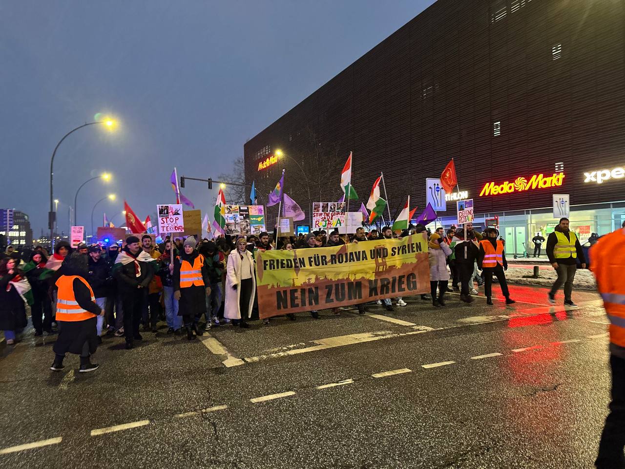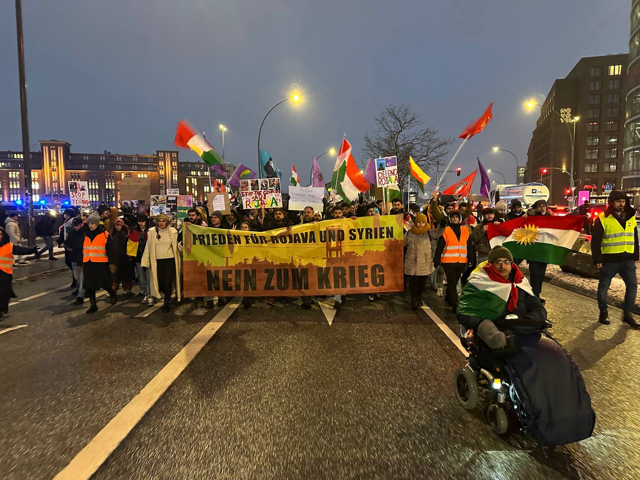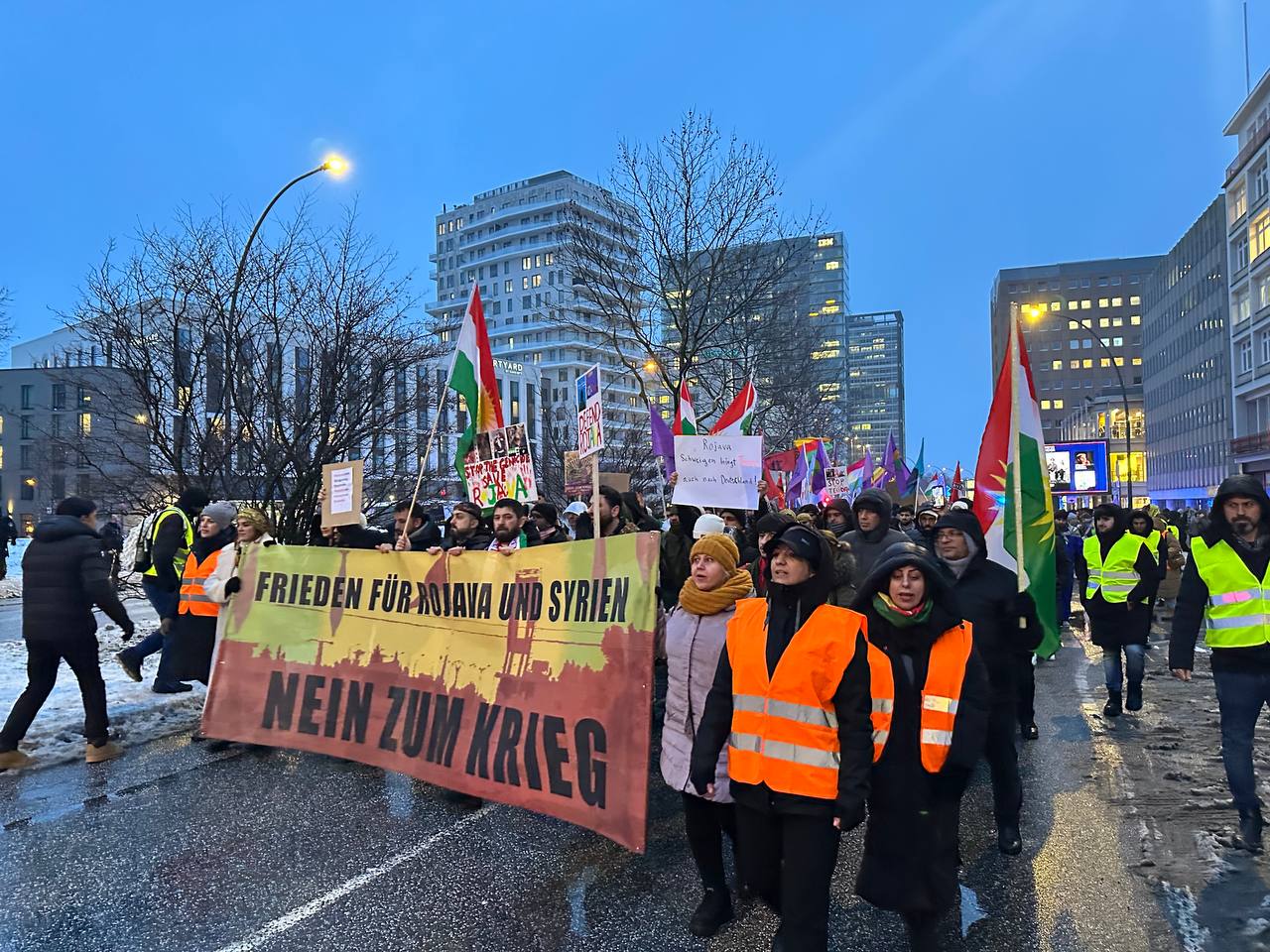 Mitingde “Türkischen Angriffskrieg und Dschihadisten Stoppen! Verteidigt Rojava und die Frauenrevolution!”, “Stoppt die Angriffe auf Rojava und Rojhilat, Solidarität mit den Protesten im Iran!” ve “Wir sind bereit, uns denen entgegenzustellen, die uns unsere Freiheit nehmen wollen!” gibi pankartlar açıldı. TEV-DEM ve Kürdistan bayraklarının yanı sıra, HTŞ çetelerinin gerçekleştirdiği katliamlara dikkat çeken dövizler de taşındı. Etkinlik, Kürdistan ve devrim şehitleri anısına yapılan saygı duruşu ile başladı.
