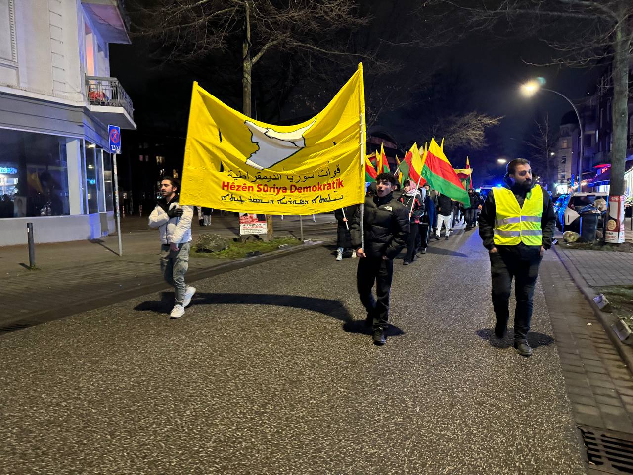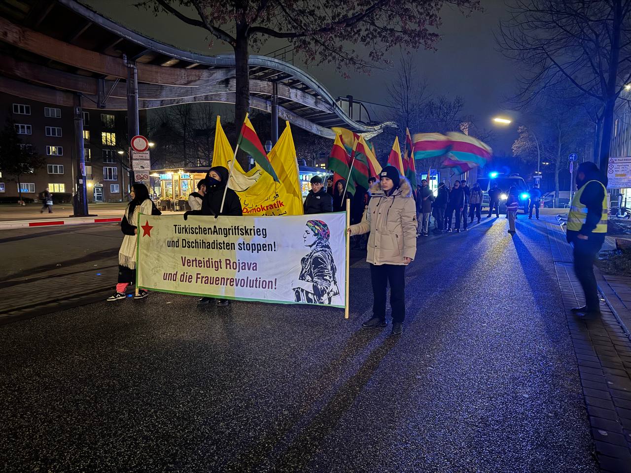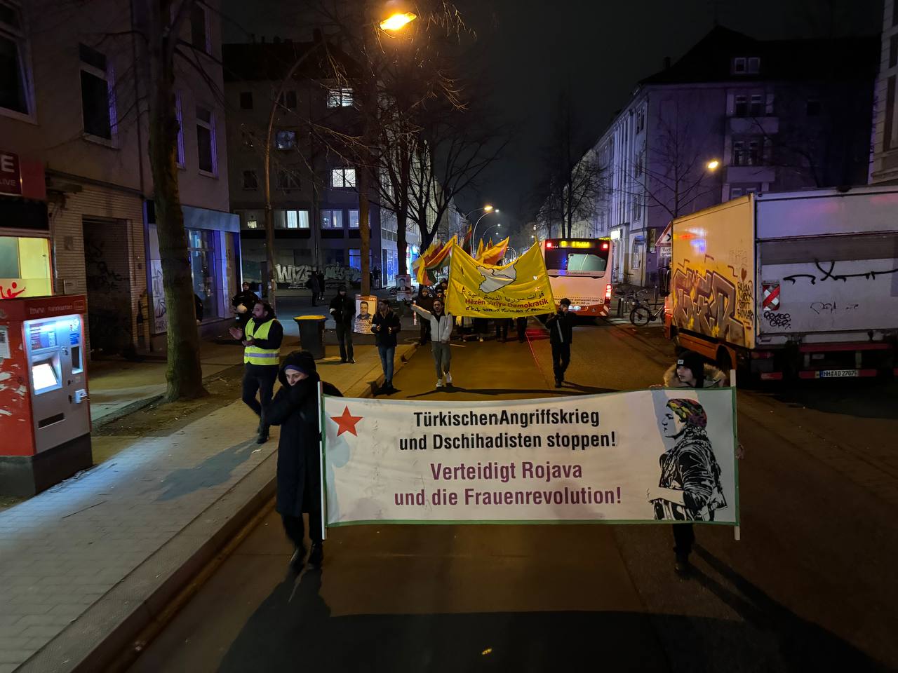 Hamburg Halk Meclisi, Hamburg Rojbin Kadın Meclisi ve Kürdistanlıların destek verdiği eylemde, “Hèzèn Sûriya Demokratik”, “TürkischenAngriffskrieg und Dachihadisten stoppen! Verteidigt Rojava und die Frauenrevolution” yazılı pankart açıldı. TEV-DEM bayraklarının taşındığı yürüyüş boyunca “Bijî Serok APO”, “Bijî Berxwedana Rojava”, “Terörist Erdoğan”, “Deutschland finanziert Türkei bombardert”, “Biji Berxwedane Rojava” sloganları atıldı.