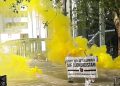 Kimyasal gaz kullanıldığına dikkat çekme amacı ile gaz maskeleri ve beyaz tulumlar giyen aktivistler sarı duman çıkartan meşaleler yaktı. Kimyasal gazı sembole eden sarı gaz kısa süre içersinde bütün Hamburg üniversitesine dağılarak dikkat çekti.iz