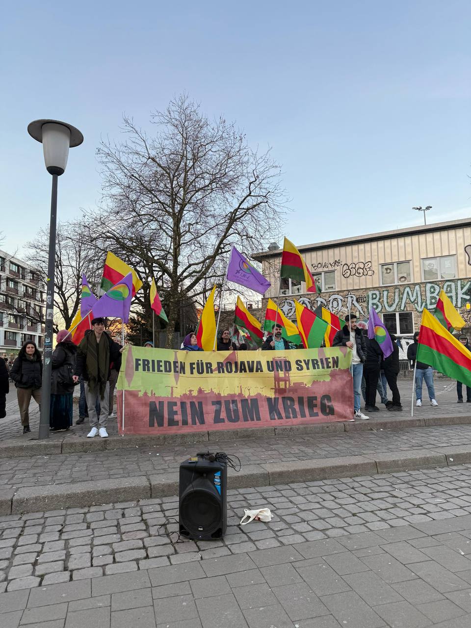 HAMBURG – Türk devletinin Kobanê’ye yönelik gerçekleştirdiği hava saldırılarında 9 kişinin hayatını kaybetmesinin ardından, Hamburg’da Kürtler ve dostları alanlara çıktı. Sternschanze Bahnhof önünde bir araya gelen kitle, Kobanê’de yaşanan katliama karşı sesini yükseltti.