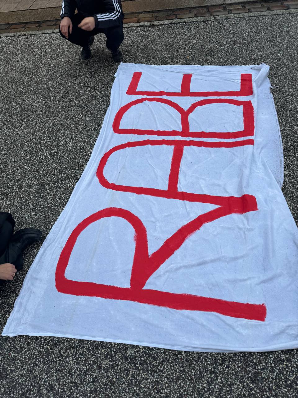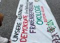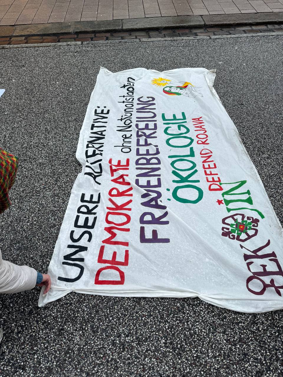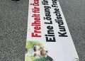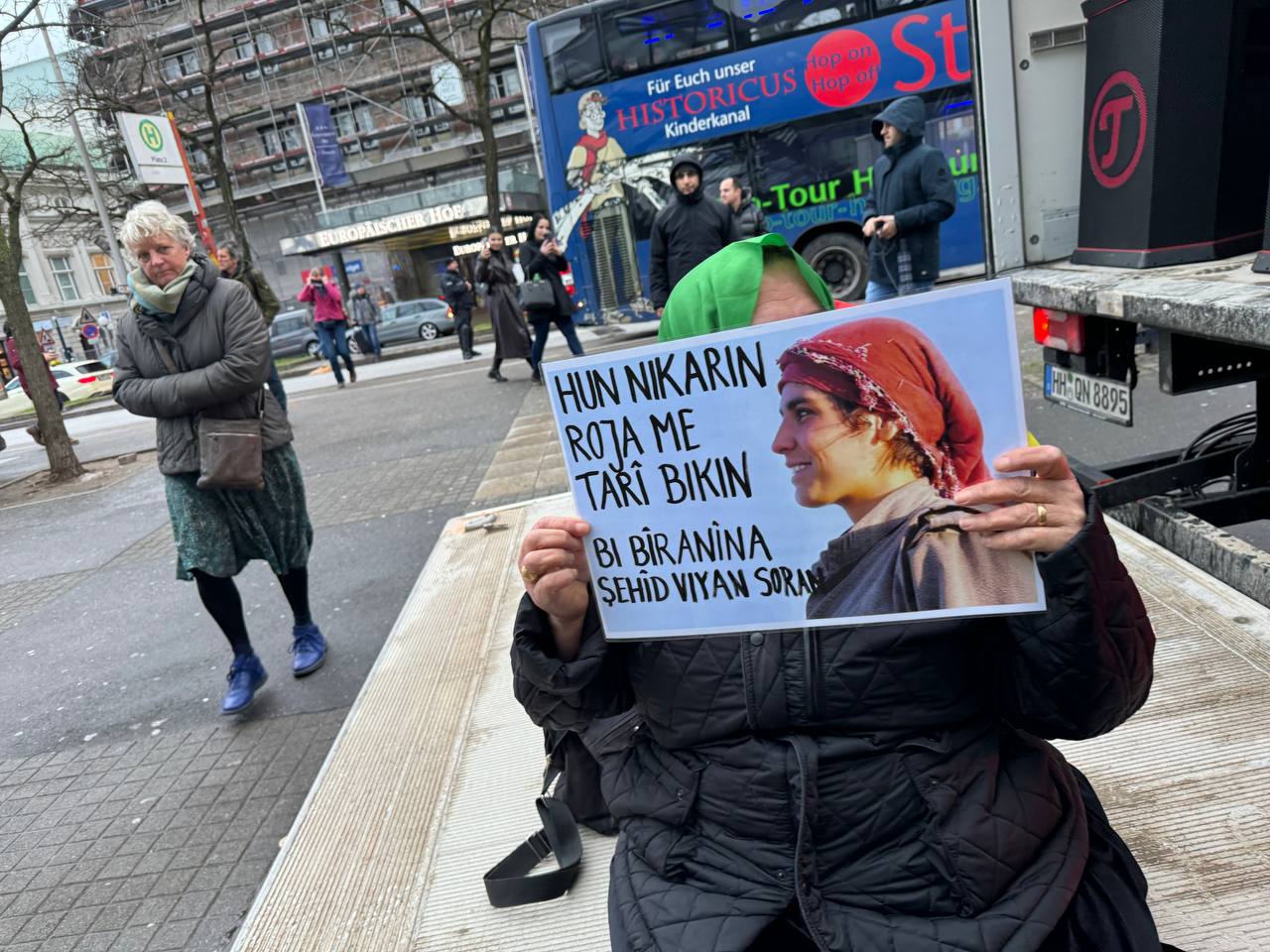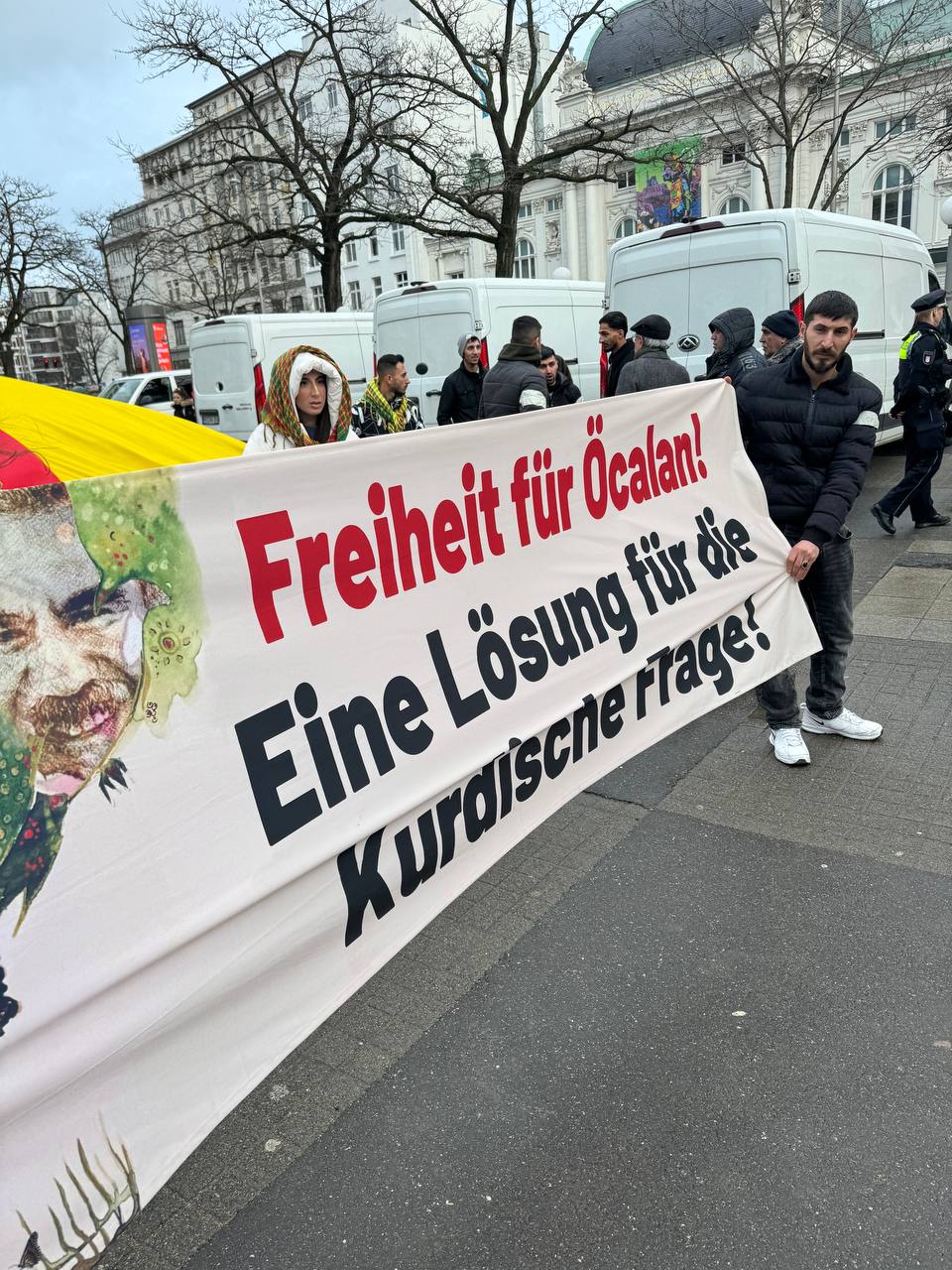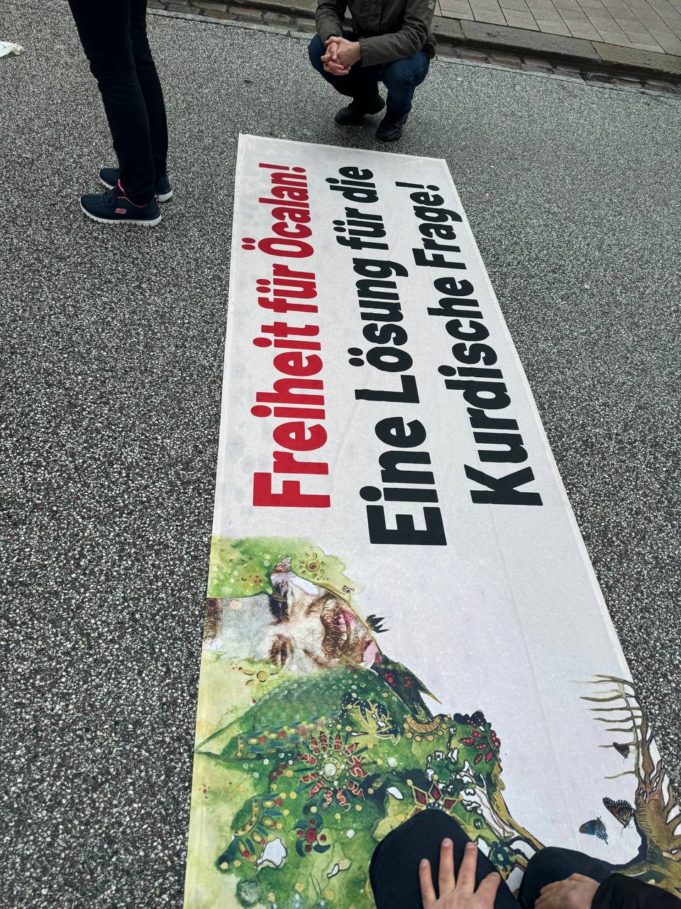 Eylemde Almanca dilinde “Önder APO’ya Özgürlük, Kürt Sorununa Çözüm” ,“ Alternatifimiz, Demokratik, Ekolojik ve Kadın Özgürlüğü Paradigmasıdır” , Kürtçe dilinde ise “Kalk” pankartları ve Şehid Vîyan Soran’ın fotoğrafları açıldı.