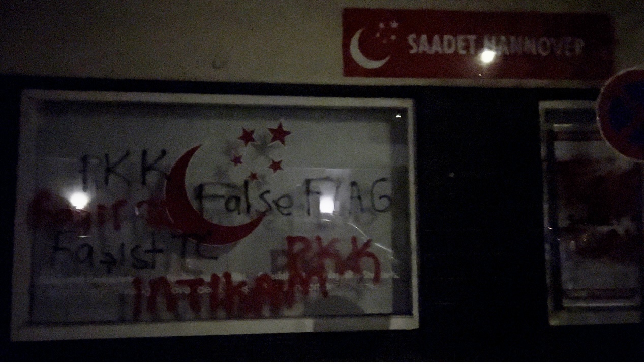 HANNOVER – Apocu Gençlik İnisiyatifi dün gece Hannover’de Faşist Türk partisine yönelik yazılama eylemi gerçekleştirdi. Gençlik Eylemi, işgalci-soykırımcı ve barbar Türk devletinin işlediği Kirli savaş politikalarına ve kimyasal silah kullanımına dikkat çekmek için yaptığını açıkladı.