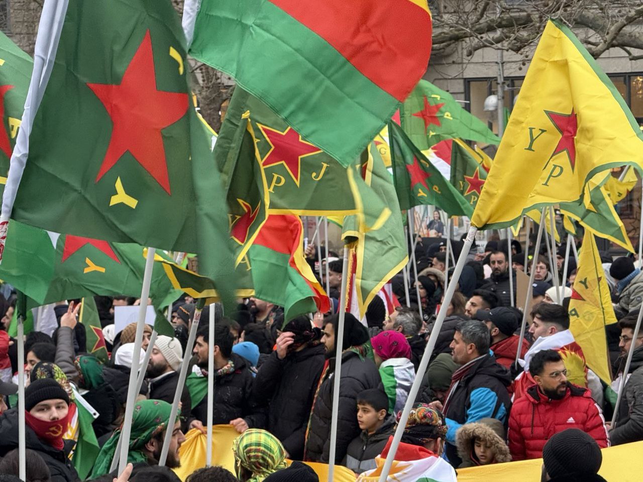 Eylem boyunca sık sık Kürtçe sloganlar atıldı. Katılımcılar, “Bijî berxwedana Rojava”, “Bijî berxwedana gelê Kurd”, “Jin jiyan azadî” ve “Rojava ne tenê ye” sloganları atıldı.