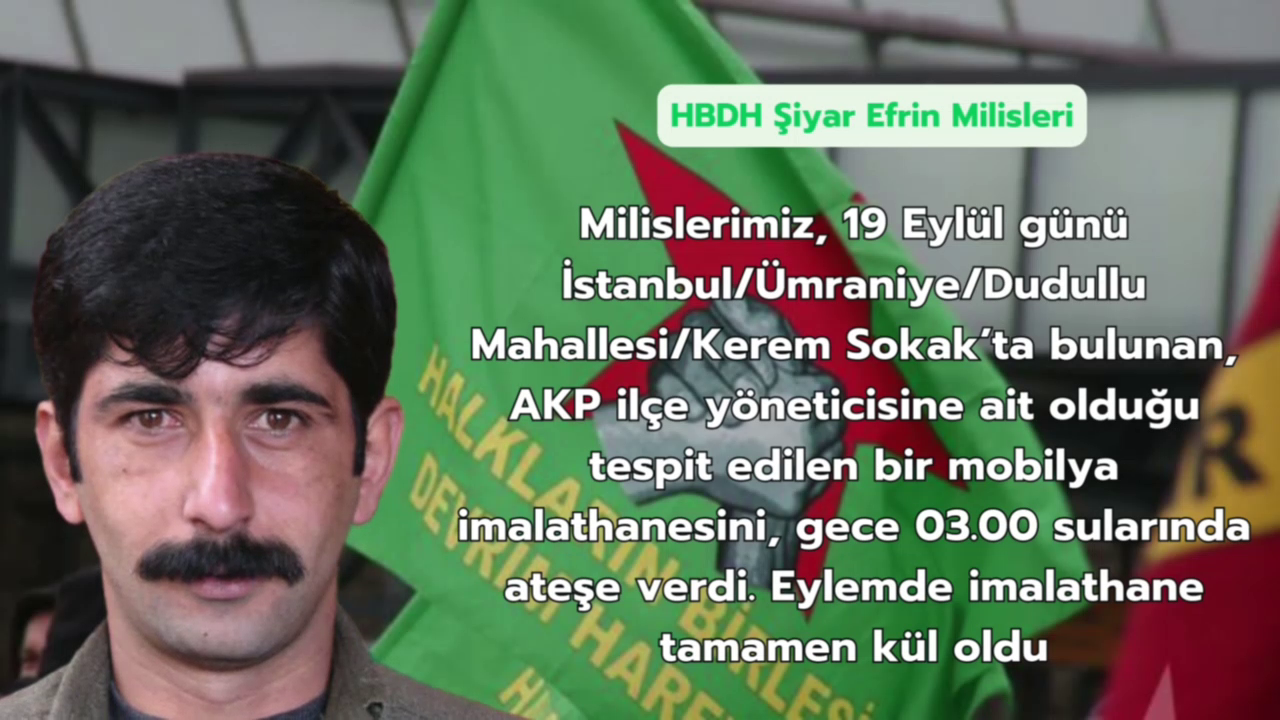 “HBDH Şiyar Efrin Milisleri, 19 Eylül günü İstanbul/Ümraniye/Dudullu Mahallesi/Kerem sokakta bulunan, AKP ilçe yöneticisine ait olduğu tespit edilen bir mobilya imalathanesini, gece 03.00 sularında ateşe verdi. Eylemde imalathane tamamen kül oldu.