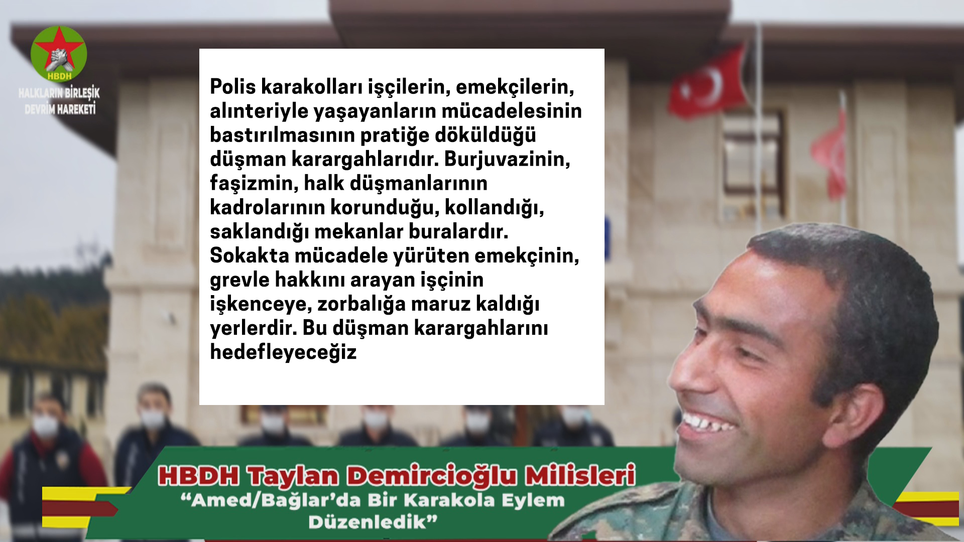 HABER MERKEZİ – HBDH Taylan Demircioğlu Milisleri Amed’in Bağlar ilçesinde bulunan Mevlana Halit Mahallesi’ndeki polis karakolunu hedef aldığını belirtti. Eyleme dair yazılı açıklamada bulunan HBDH Taylan Demircioğlu Milisleri, “düşman karargahlarını hedefleyeceğiz” belirlemesinde bulundu.