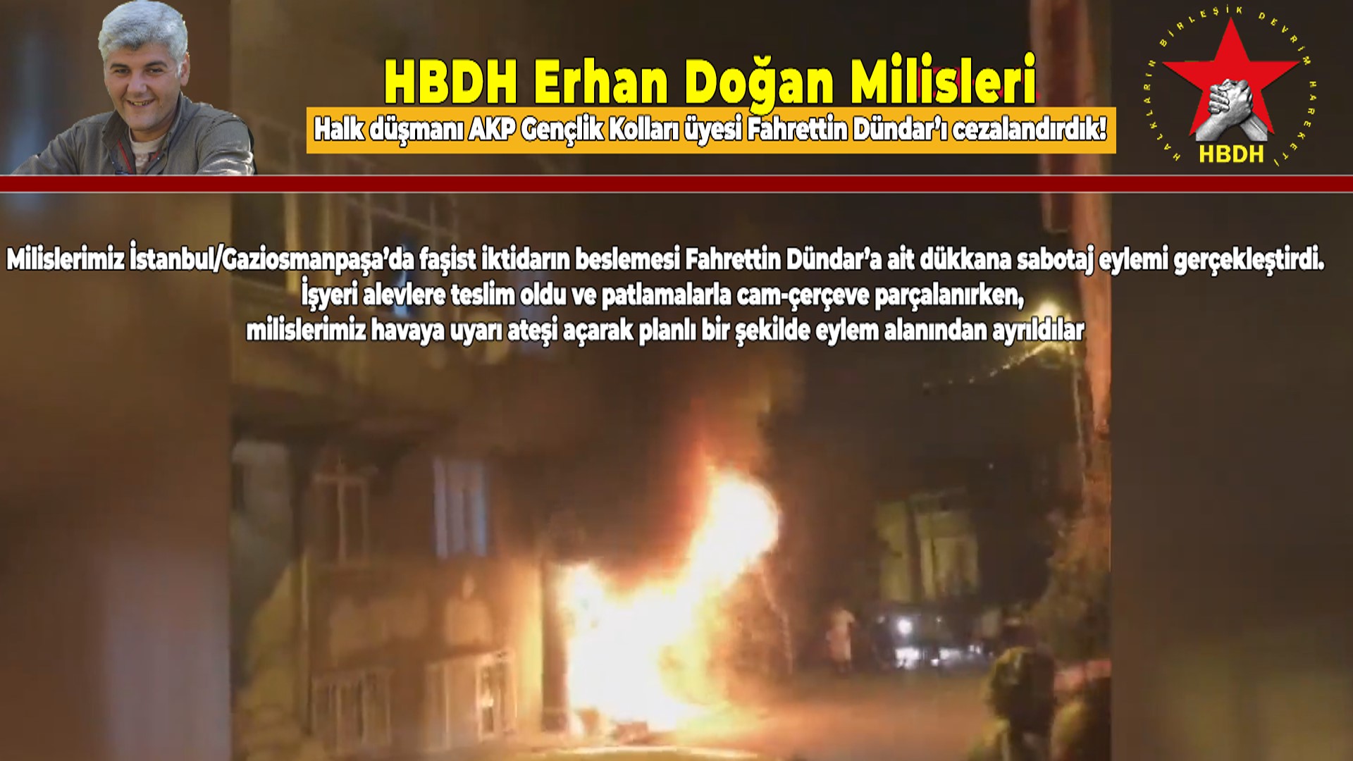 İSTANBUL –HBDH Erhan Doğan Milisleri AKP Gençlik Kolları’nda görev alan faşist Fahrettin Dündar isimli kişiyi hedef aldığını duyurdu.  İstanbul/Gaziosmanpaşa’da faşist Fahrettin Dündar’a ait dükkana sabotaj eylemi gerçekleştiren milisler ” Halkımıza düşmanlık ettiğiniz sürece ensenizdeyiz” ifadelerine yer verdi.