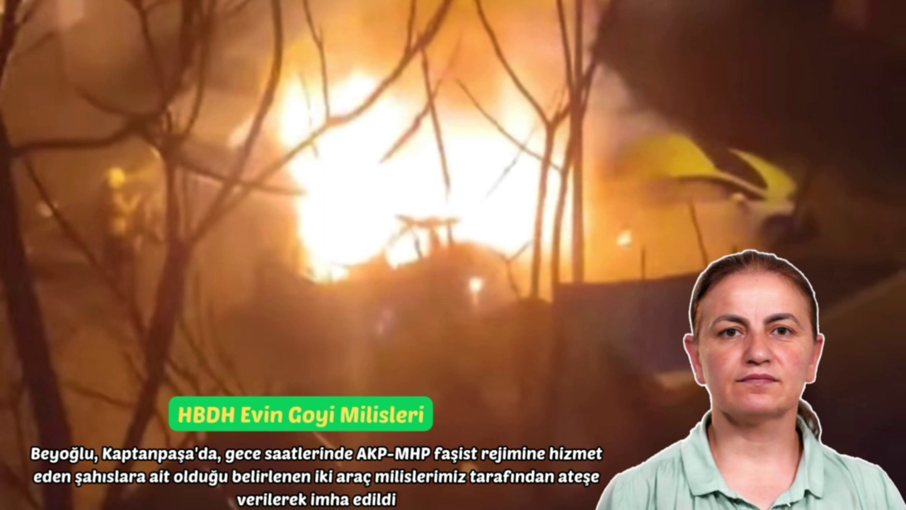 1) Beyoğlu, Kaptanpaşa’da, gece saatlerinde AKP-MHP faşist rejimine hizmet eden şahıslara ait olduğu belirlenen iki araç milislerimiz tarafından ateşe verilerek imha edildi.
