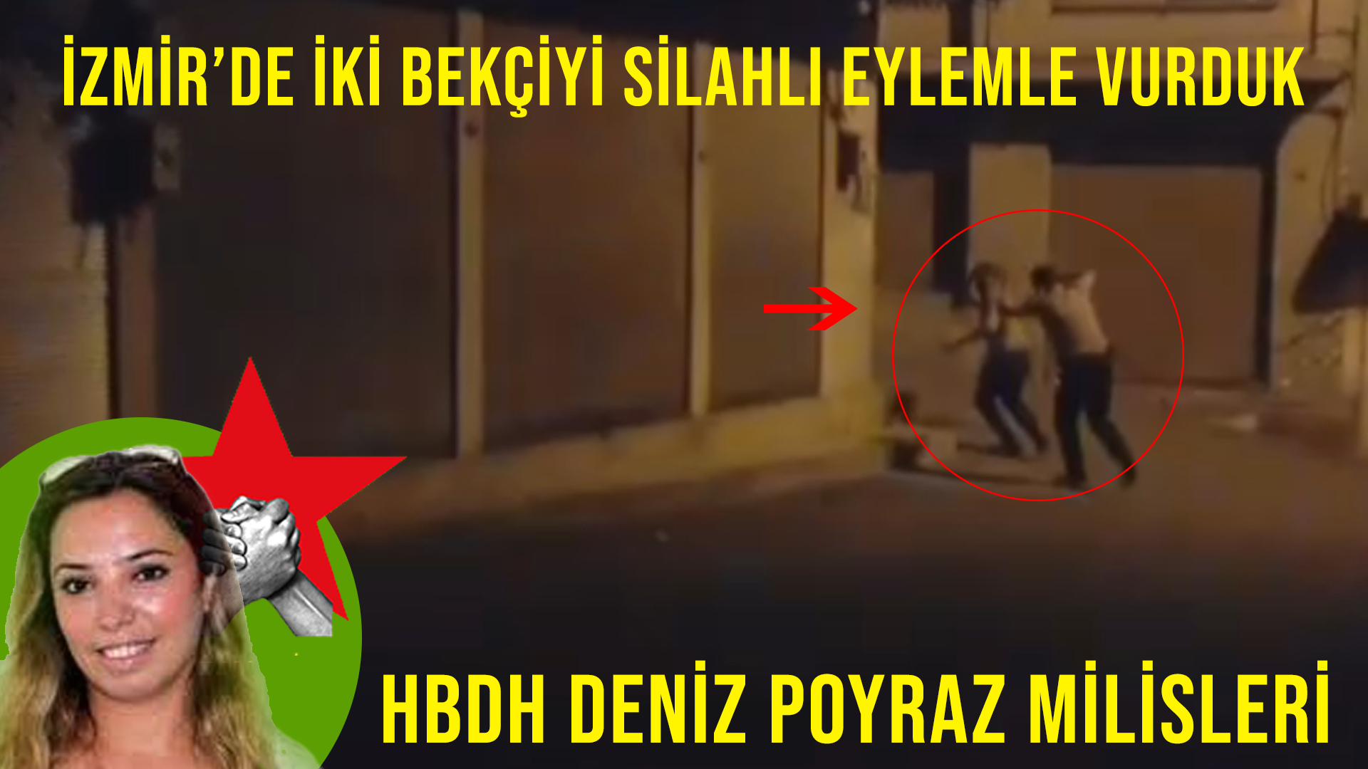 HABER MERKEZİ – HBDH Deniz Poyraz Milisleri yaptığı yazılı açıklamada “4 Eylül 2021 günü gece 02:00 sıralarında İzmir Konak Kemeraltı Çarşısı Anafartalar caddesi 930 sokak üzerinde devriye gezen saray faşizminin üniformalı bekçileri gerçekleştirdiğimiz eylemle vuruldu. Silahla hedef aldığımız iki bekçi yaralı halde kaçtı” dedi.