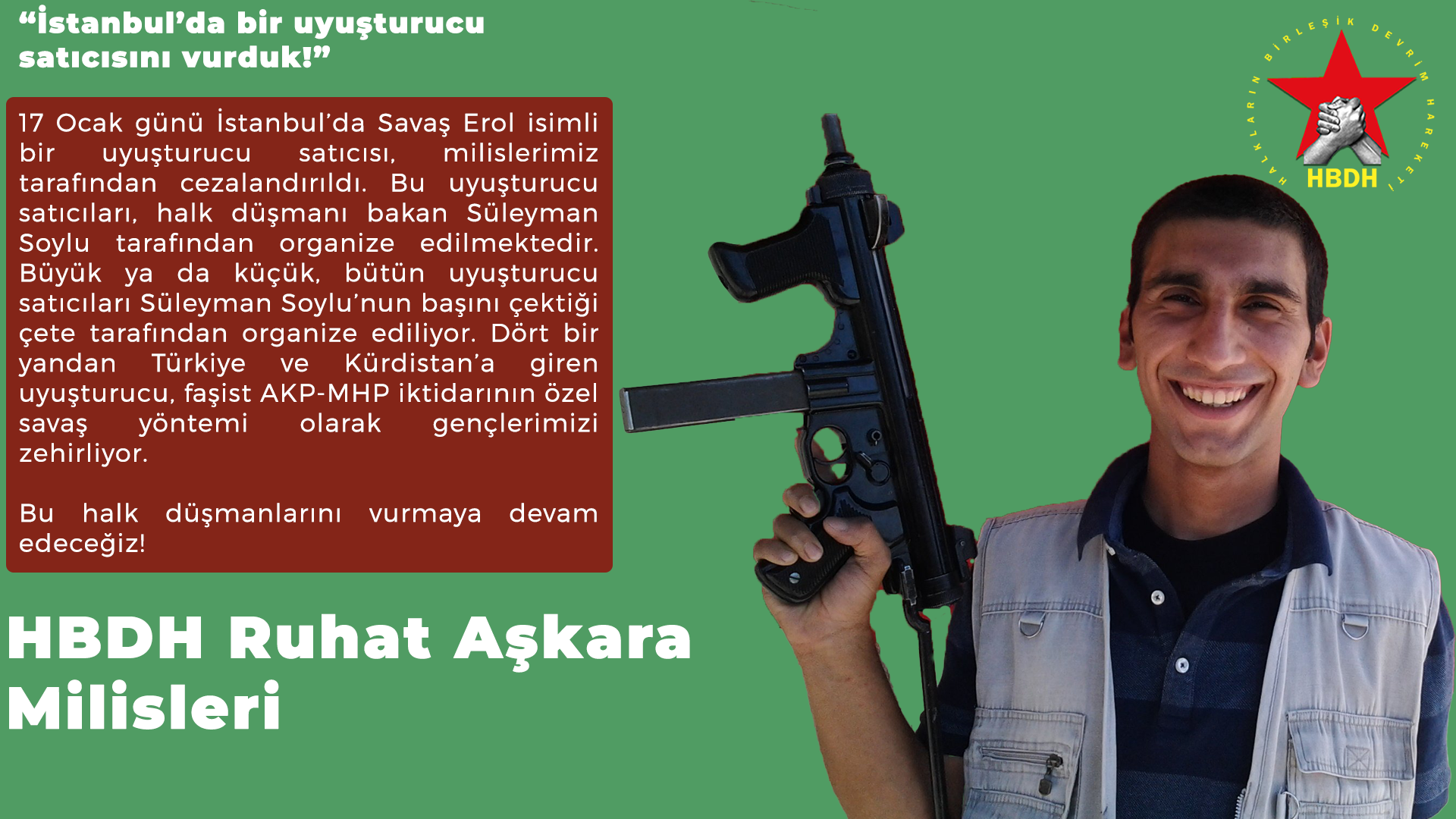 “Bu uyuşturucu satıcıları, halk düşmanı bakan Süleyman Soylu tarafından organize edilmektedir. Büyük ya da küçük, bütün uyuşturucu satıcıları Süleyman Soylu’nun başını çektiği çete tarafından organize ediliyor. Dört bir yandan Türkiye ve Kurdistan’a giren uyuşturucu, faşist AKP-MHP iktidarının özel savaş yöntemi olarak gençlerimizi zehirliyor. Bu halk düşmanlarını vurmaya devam edeceğiz!”