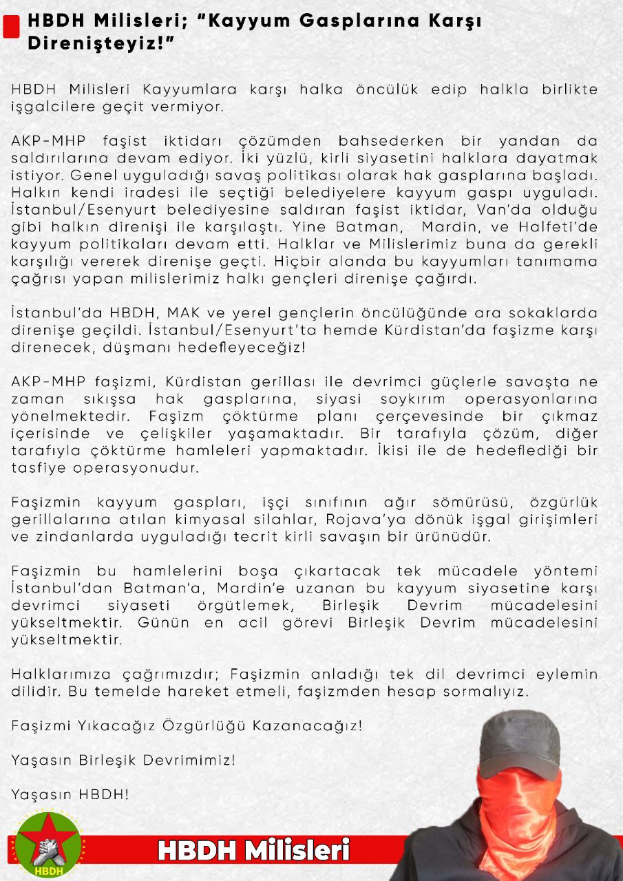 “AKP-MHP faşist iktidarı çözümden bahsederken bir yandan da saldırılarına devam ediyor. İki yüzlü, kirli siyasetini halklara dayatmak istiyor. Genel uyguladığı savaş politikası olarak hak gasplarına başladı. Halkın kendi iradesi ile seçtiği belediyelere kayyum gaspı uyguladı. İstanbul/Esenyurt belediyesine saldıran faşist iktidar, Van’da olduğu gibi halkın direnişi ile karşılaştı. Yine Batman, Mardin, ve Halfeti’de kayyum politikaları devam etti. Halklar ve Milislerimiz buna da gerekli karşılığı vererek direnişe geçti. Hiçbir alanda bu kayyumları tanımama çağrısı yapan milislerimiz halkı gençleri direnişe çağırdı.